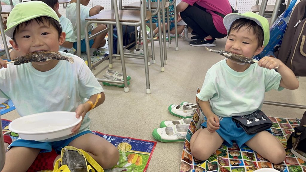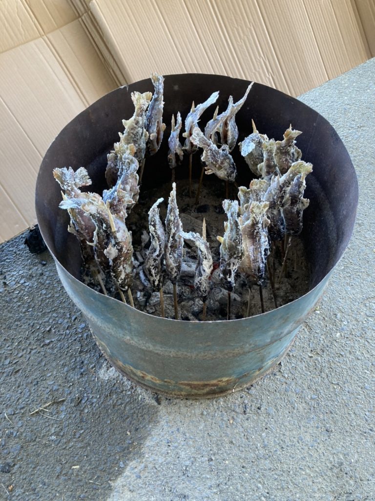 お待ちかねの昼食タイム♪自分で捕まえた魚は塩焼きになりました。