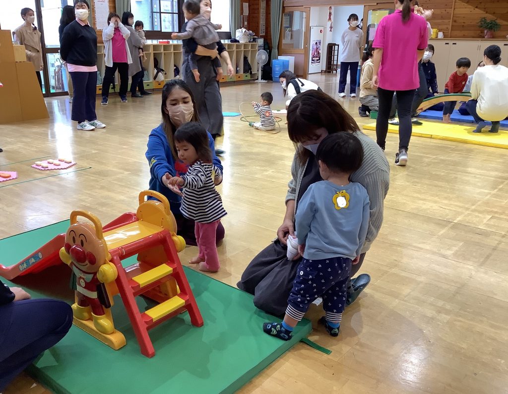 滑り台や平均台,フラフープなどが広がった遊戯室で好きな遊びを見つけて,おうちの方と一緒に元気いっぱい遊びました。