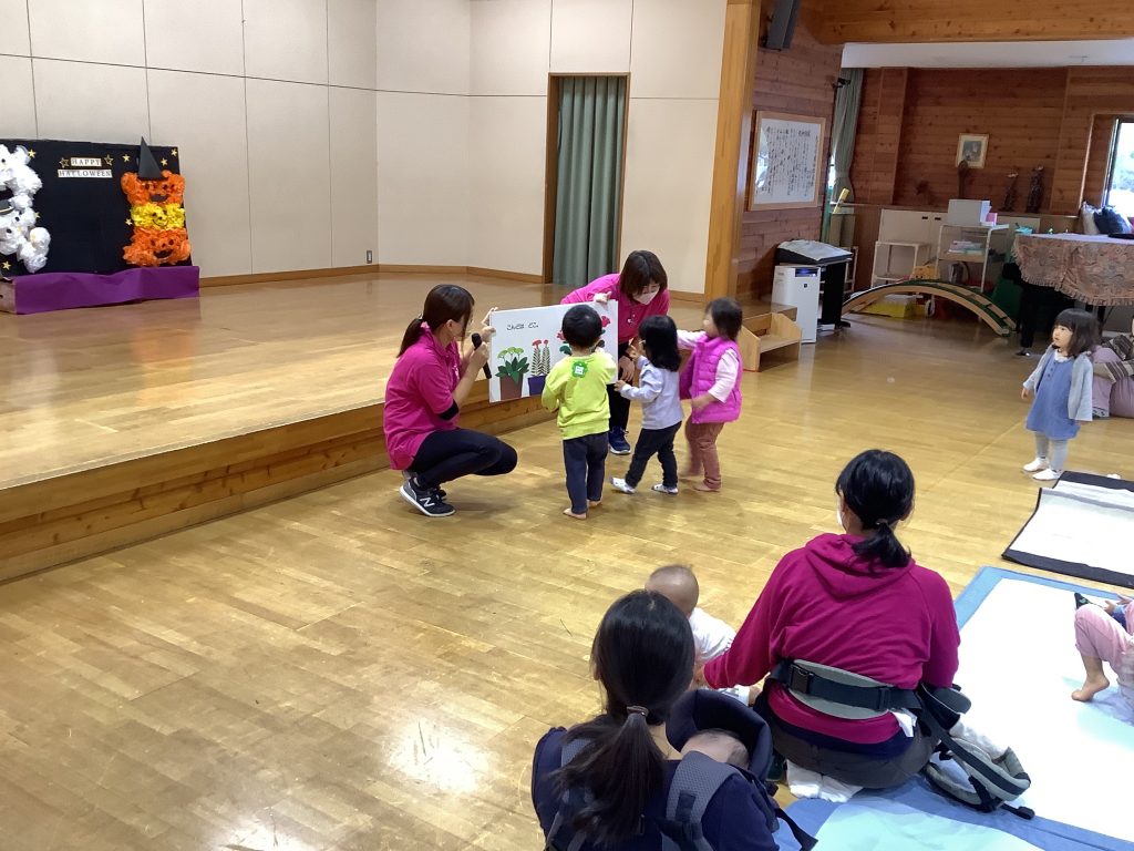 最後にはみんなで集まって,大型絵本やエプロンシアターを見たり,リトミックをしたりして楽しいひとときを過ごしました。