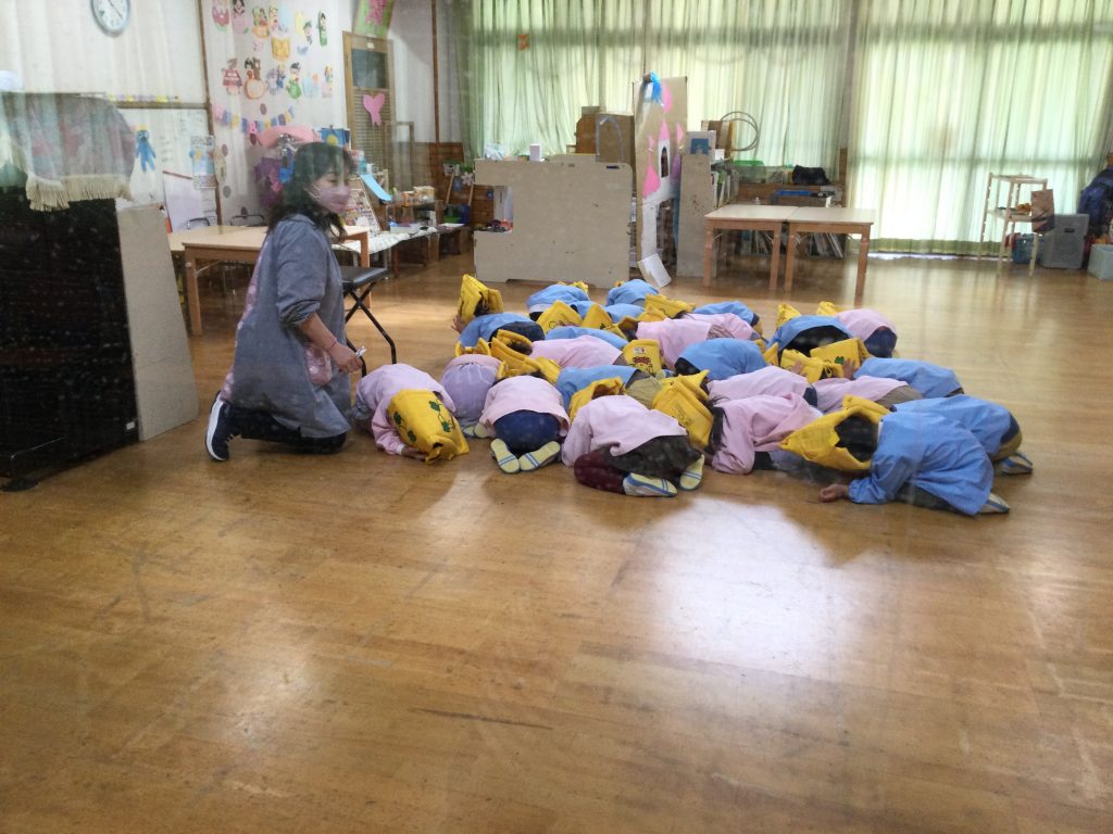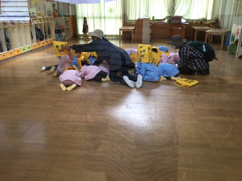 みんなで集まり,ダンゴムシのポーズ(頭を丸めて身を守ります)をする姿は皆,真剣な表情でした。