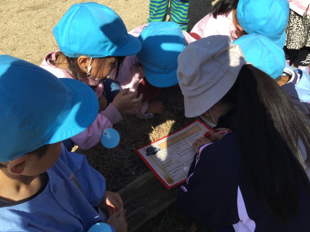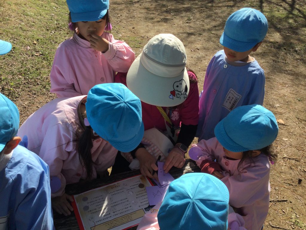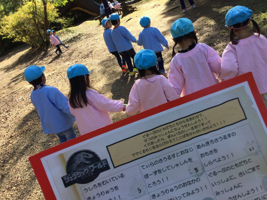 今日は6つのグループに分かれて1日行動する,4歳児クラスのお友達。当日までグループ活動を重ね,仲間意識が出てきたようです!
