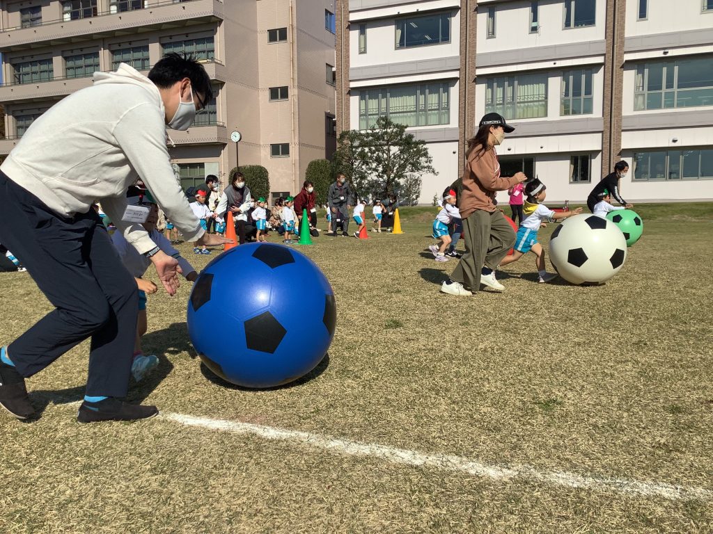 短大の芝生に集まり,準備体操や触れ合い遊びをしました。