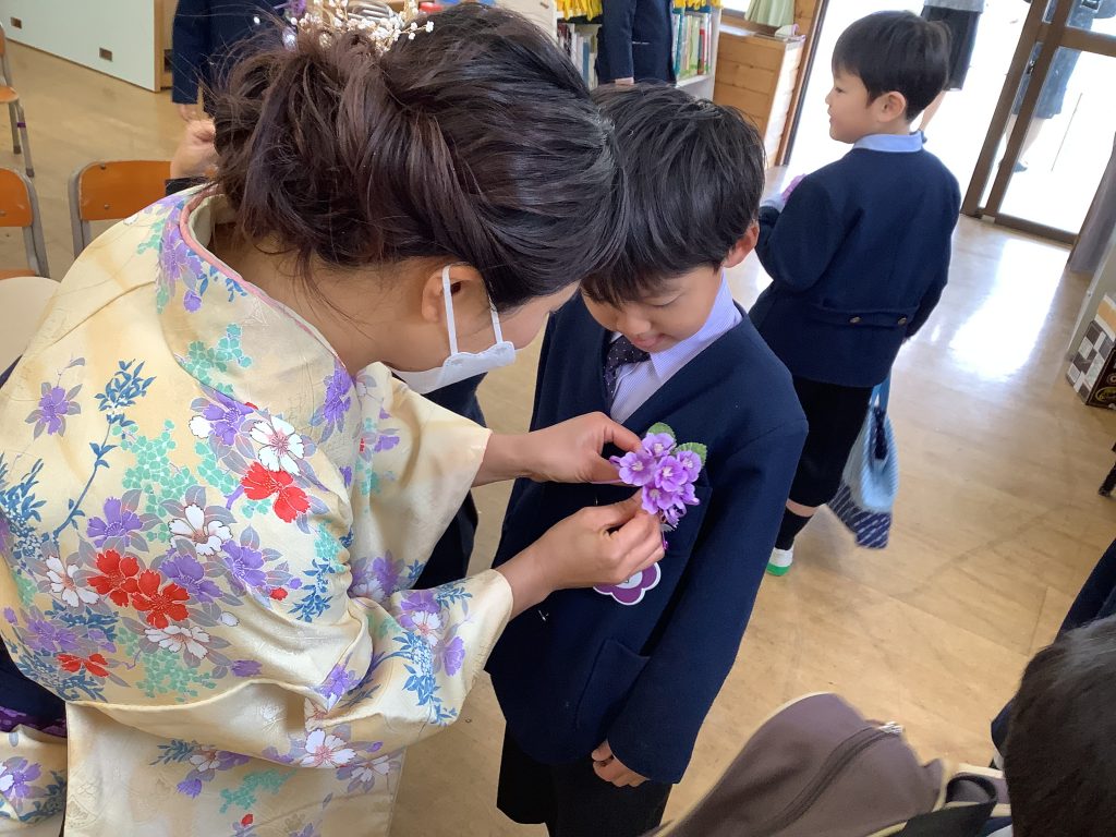 クラスカラーのコサージュをつけてもらい,式に臨みます💐