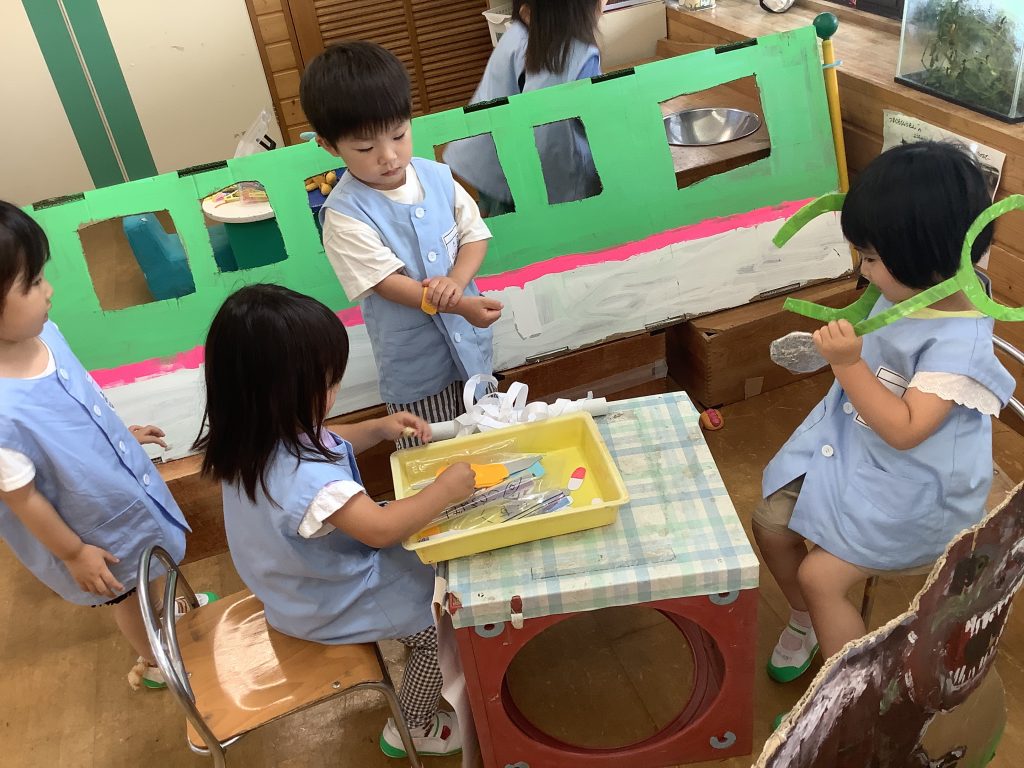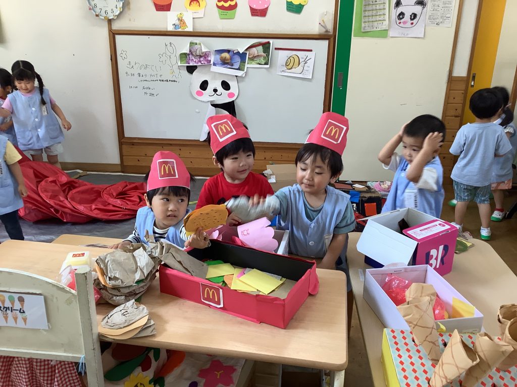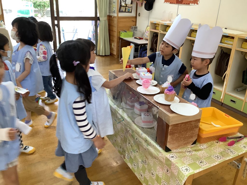 お店屋さんごっこも楽しんでいます。4歳児になると,少しずつ自分たちで作り出しながら遊びを作り出しています。友達とのやり取りも楽しくなってきましたね♪