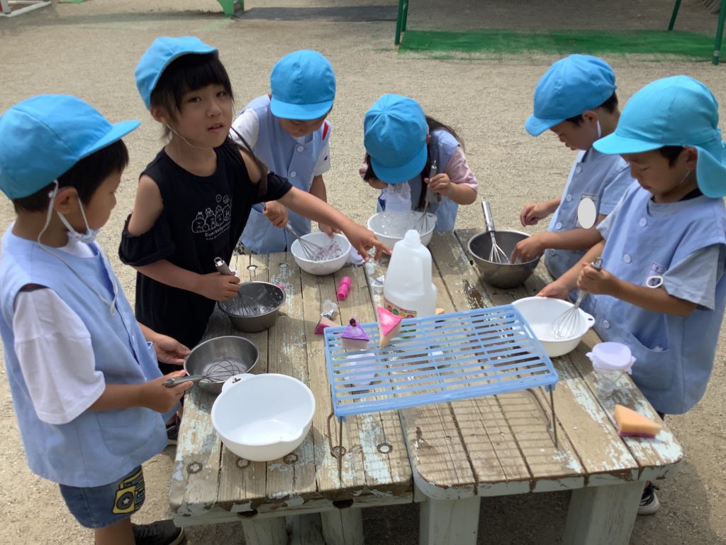 水遊びや泡遊び🫧自分たちで泡を作りだしています。どうしたらふわふわの泡ができるかな?試しながら作っています。