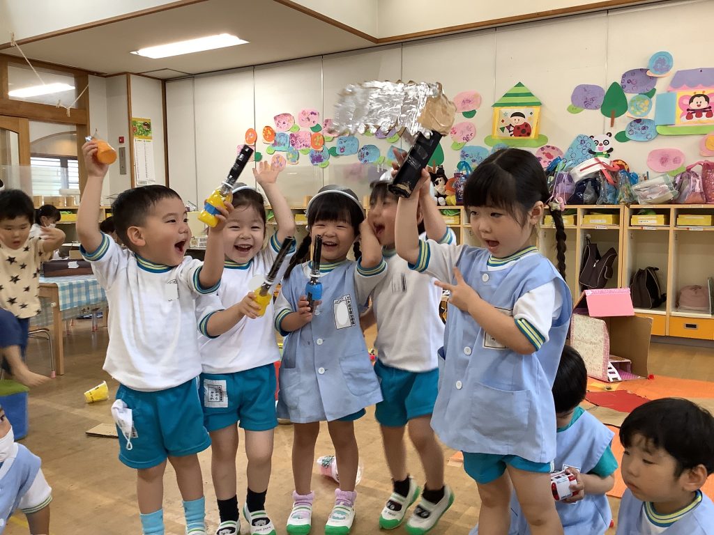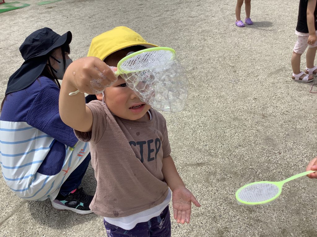 様々な道具を使い,シャボン玉を飛ばしています。いい風と共にキラキラひかるシャボン玉の様子に大興奮の子どもたちです。