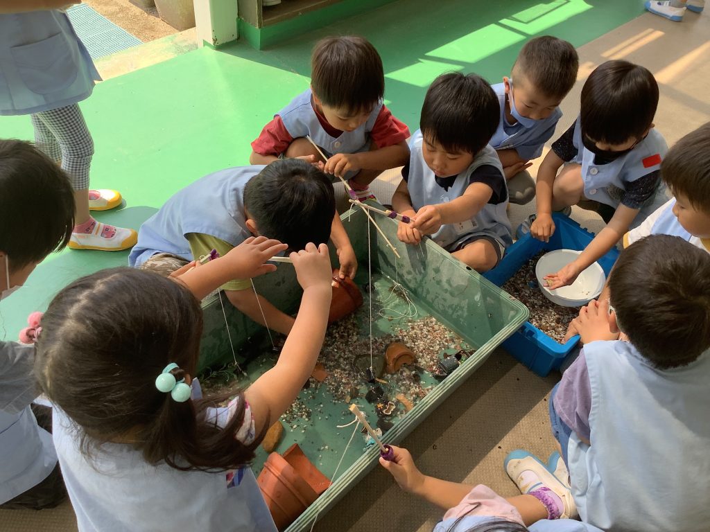 園外保育で5歳の友達がザリガニ釣りをしていた様子をまねて,遊んでいます。上手に釣れるかな〜?表情は真剣です!