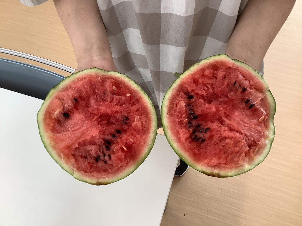 ひとつだけ割ってみると,なんと中は真っ赤な甘そうなスイカ🍉