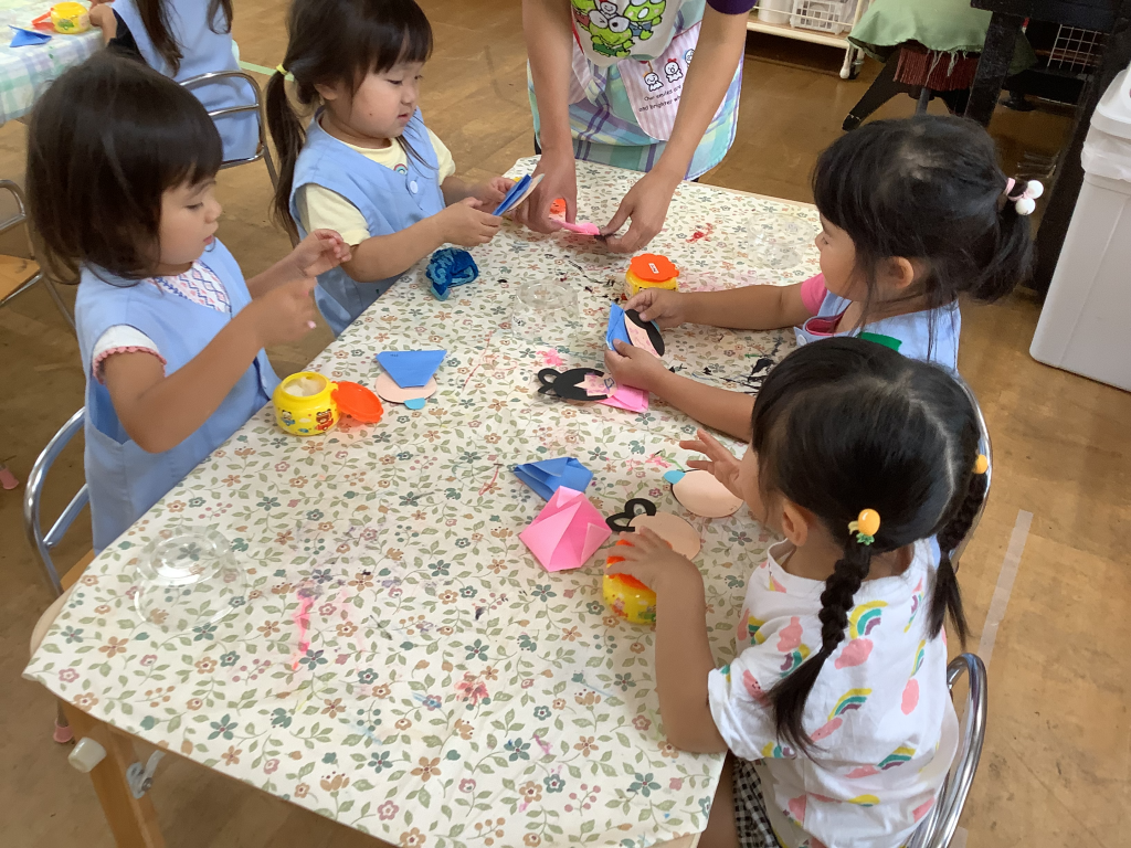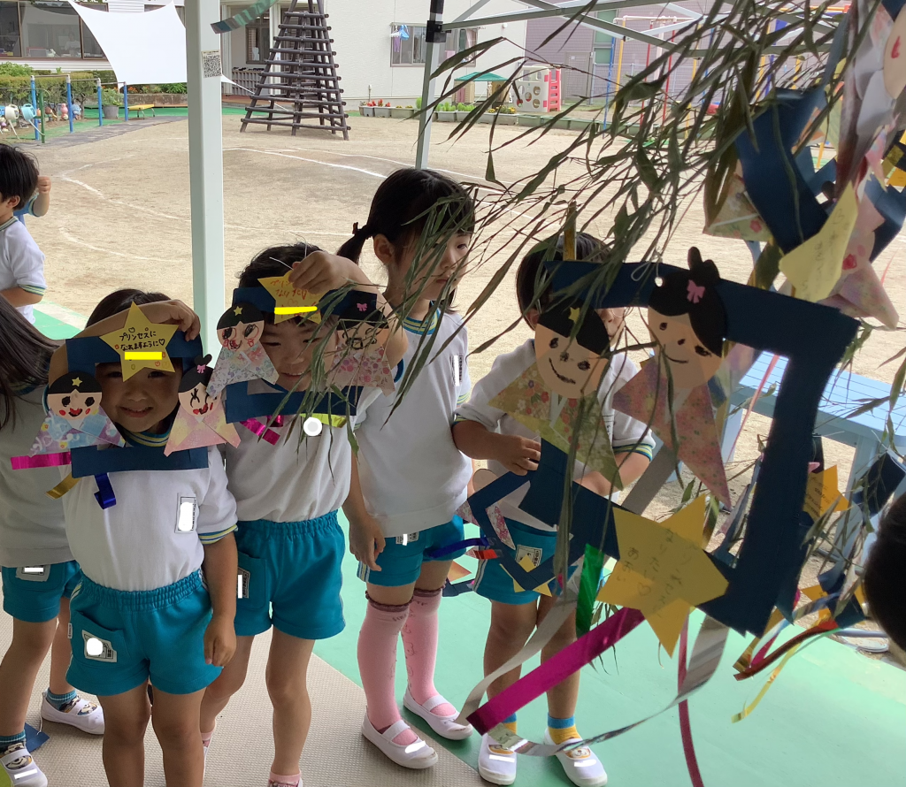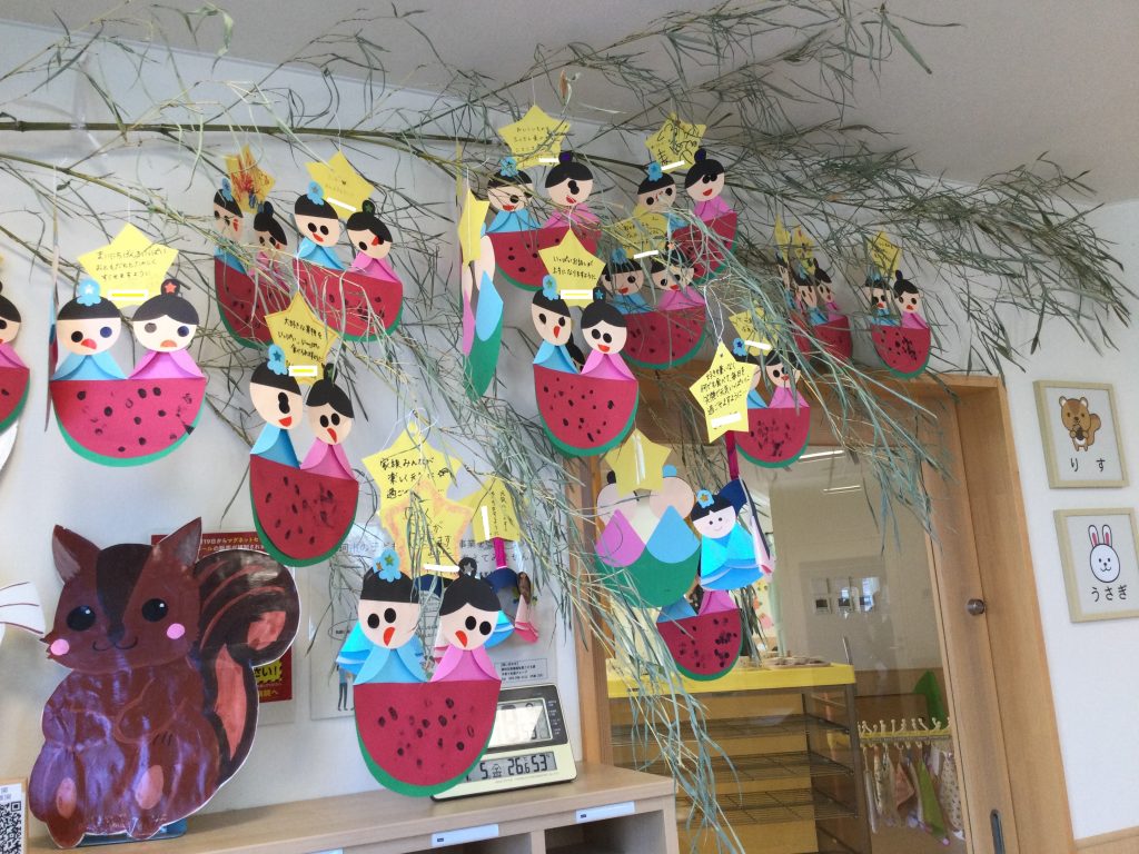 4歳児は様々な素材を使いながら製作しました。お家の人に願いを書いてもらい笹に飾り付けました。