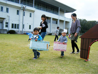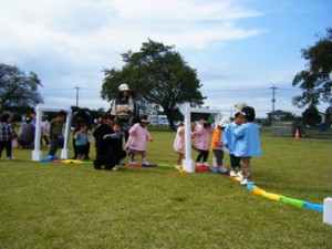 10月18日(火)隣接する茨城女子短期大学の芝生のグランドで、おやこひろば『ぽぽ』に来た友達と一緒に遊びました。清々しい青空の下で年少組の友達と「マル・マル・モリ・モリ」のダンスを踊ったり、ルピナスの会の方によるお話を聞いたりしながら楽しく過ごす事ができました。