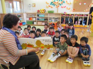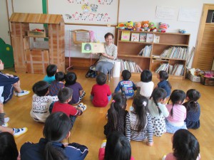 今日は、もも組•うめ組にルピナスの方が絵本の読み聞かせに来て、素敵な物語を話してくださいました。