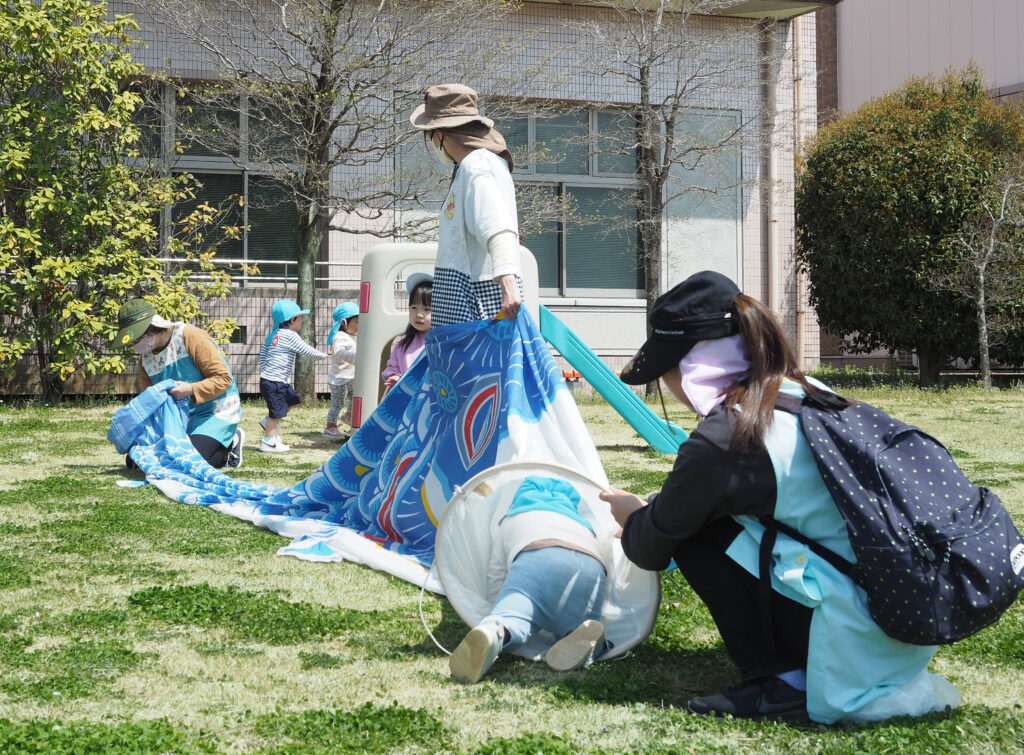 短大の芝生の上に青いこいのぼりが登場しました。そしてこあら組(2歳児)のこいのぼりくぐりが始まりました(*^_^*)