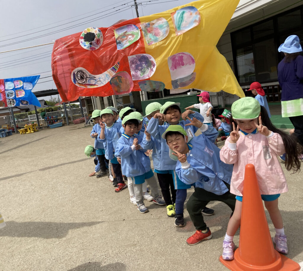 年長さんが絵の具でうろこを描いて作ったこいのぼりも鮮やかにに泳いでいます。