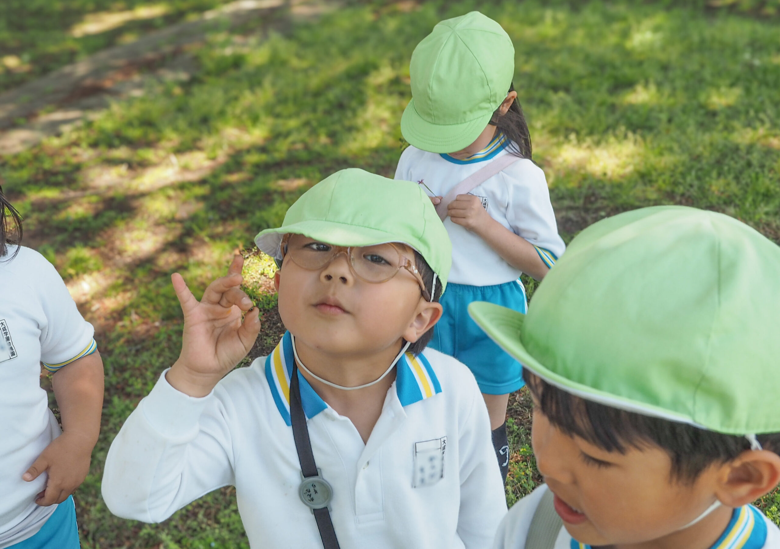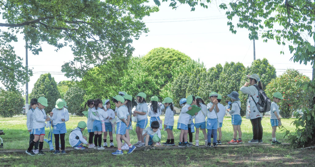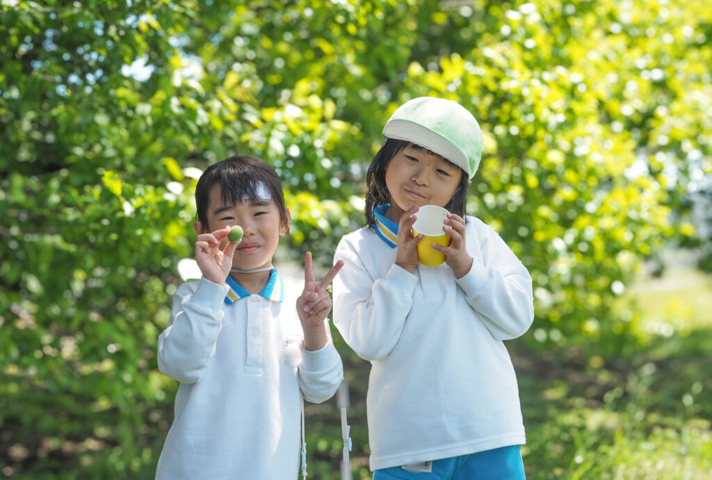 連休明けの爽やかな晴天の午前中、年長(5歳児)さんが昨日の風雨で落ちていた梅の実を拾っていました🍏