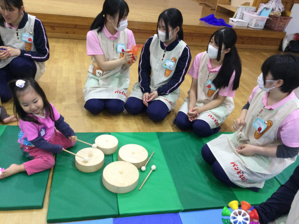 「綺麗な音がするね〜✨」お友達と一緒に色々な楽器をならしてお顔もにっこり😄