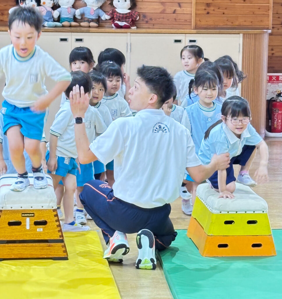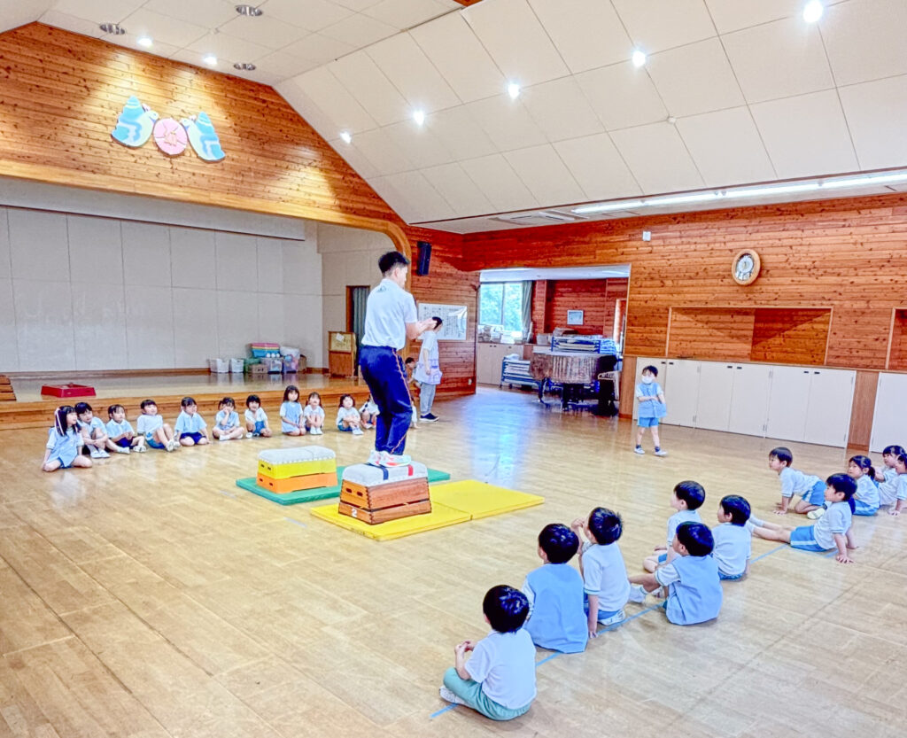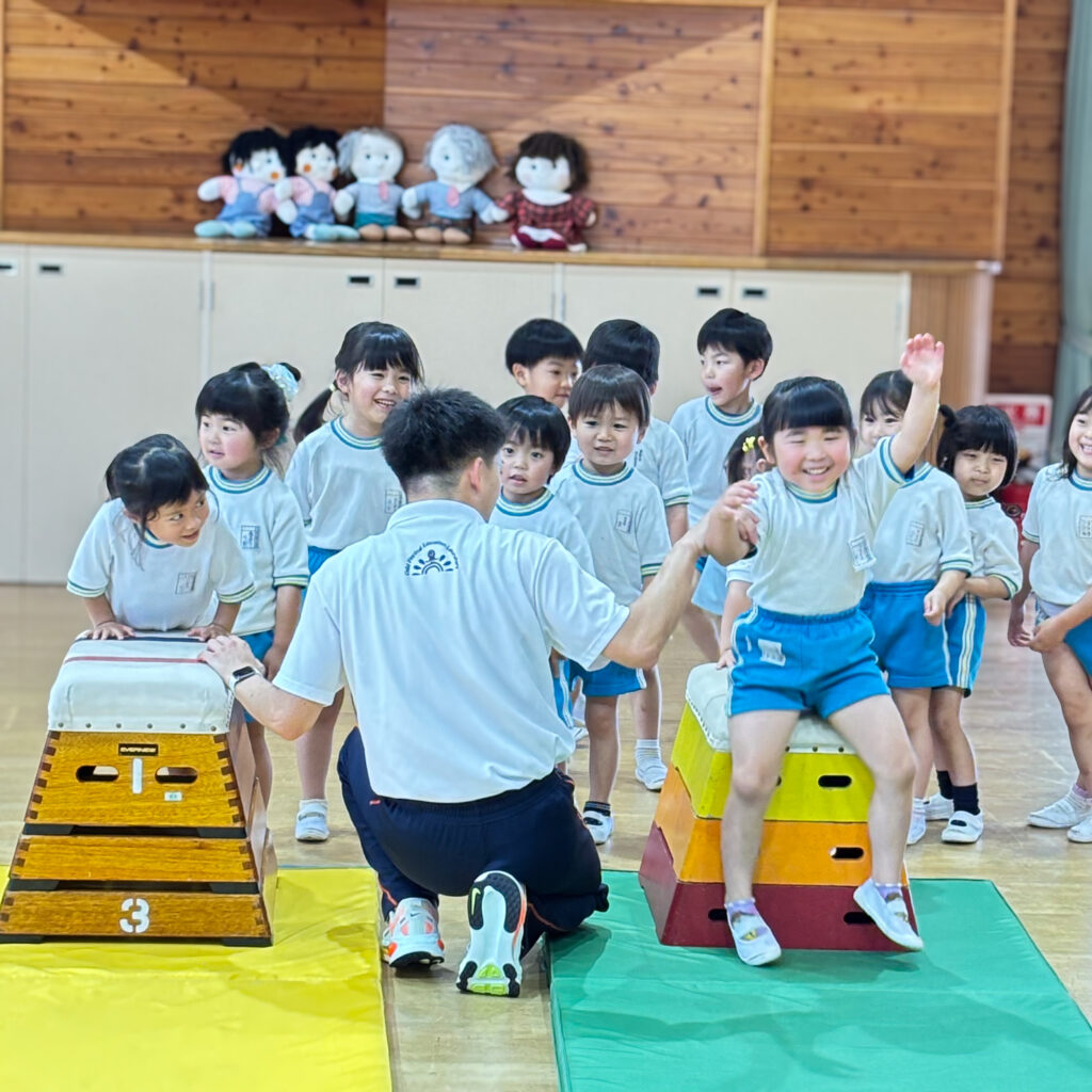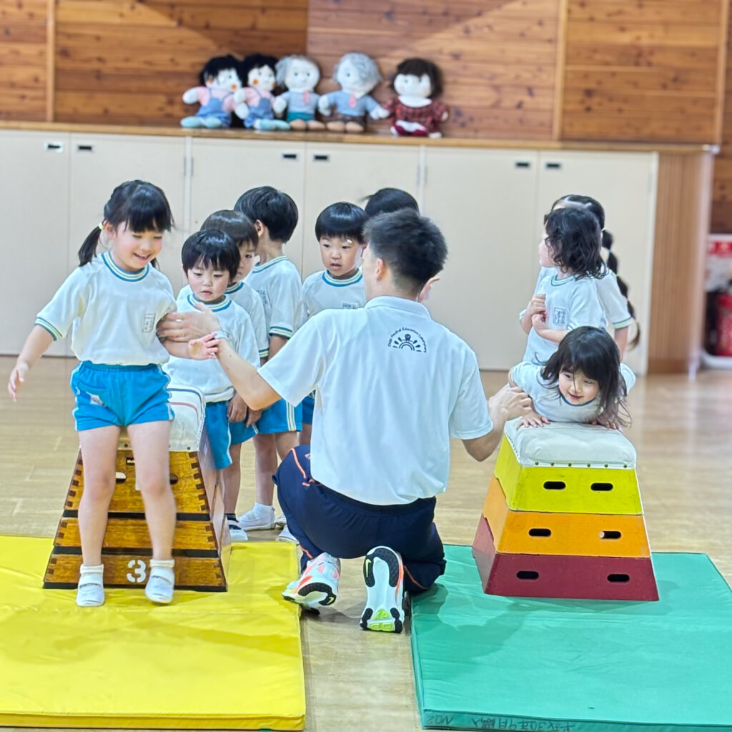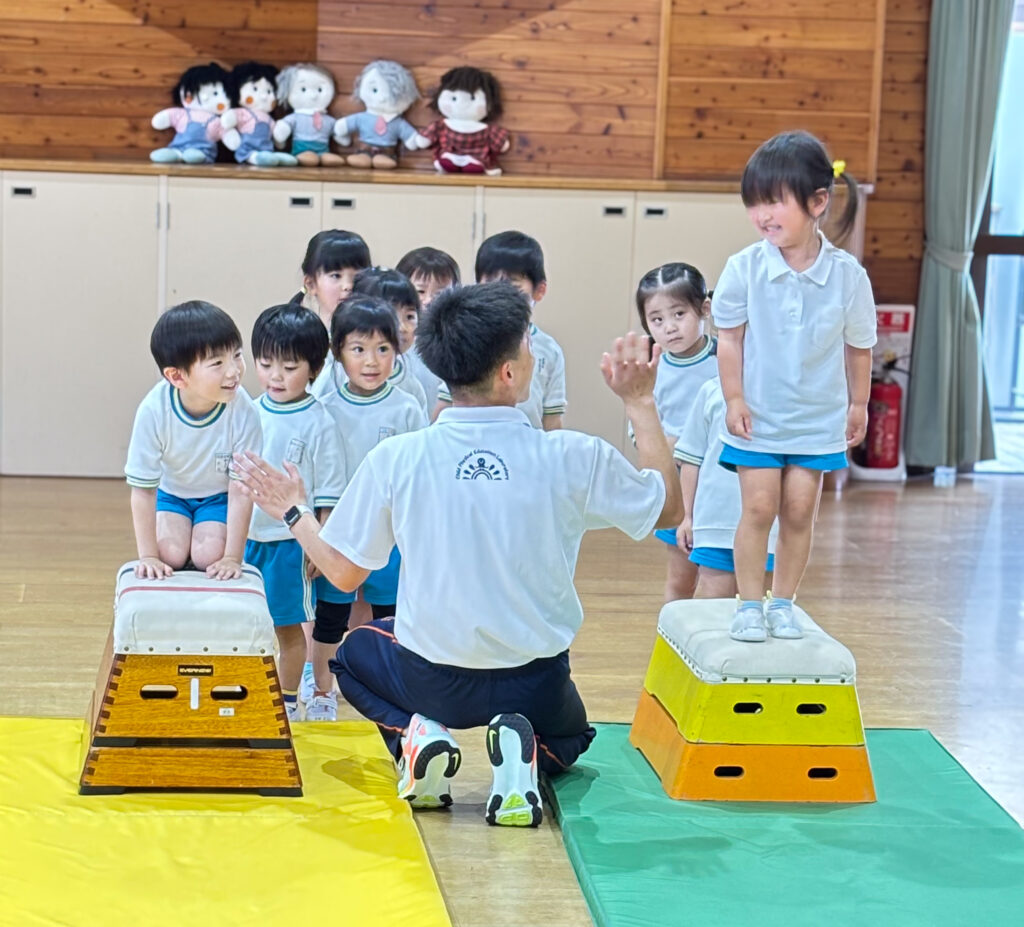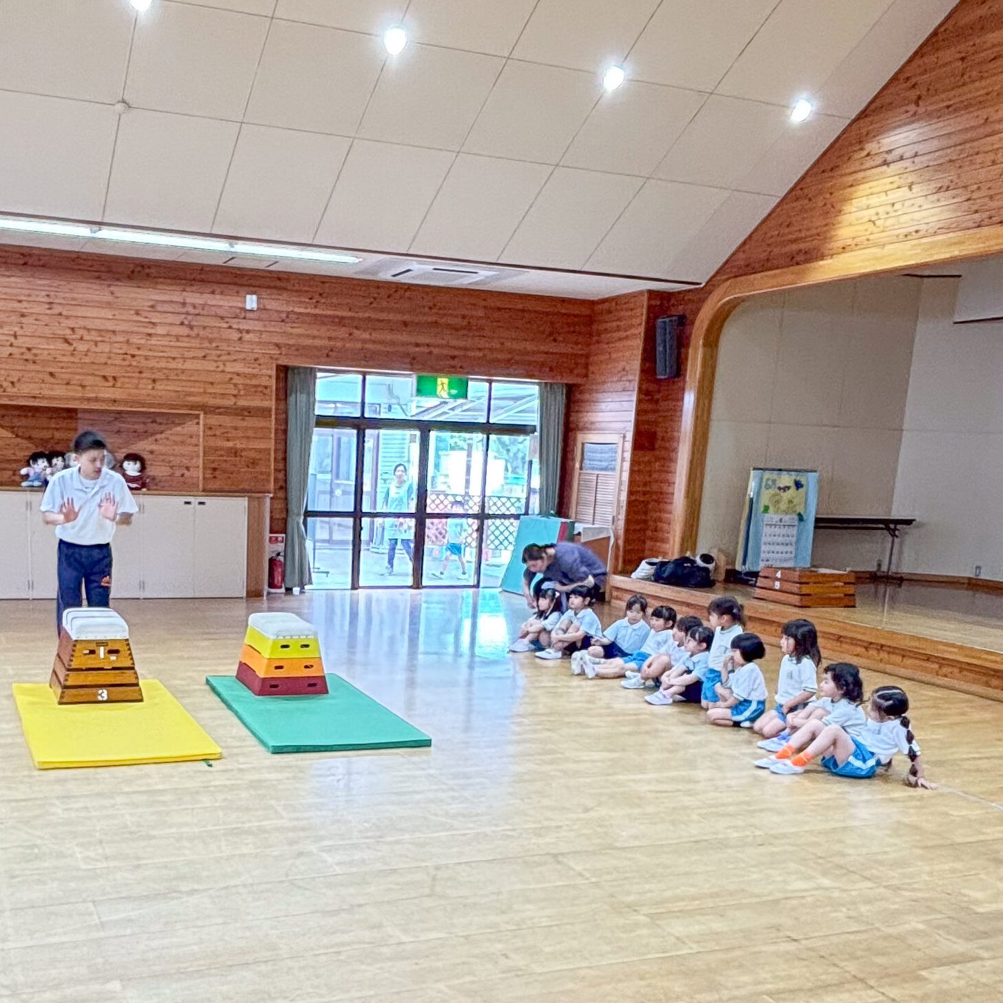 遊戯室の様子を見てみると4歳児(くま組)さんたちが跳び箱の練習をしていました🤸