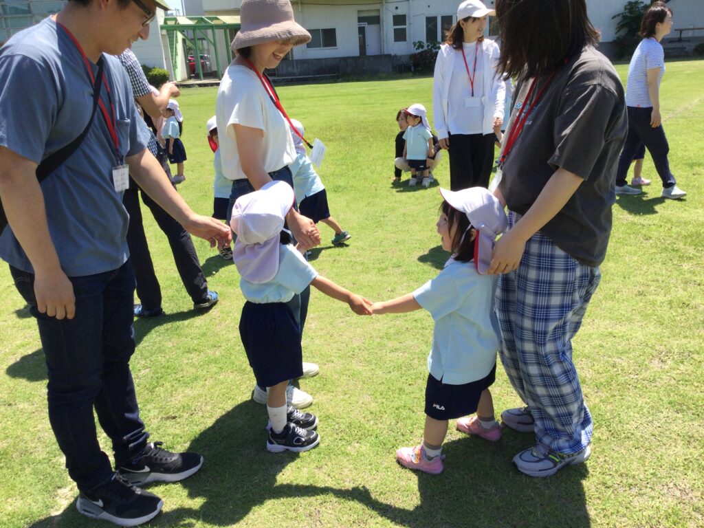 新しいお友達と仲良れるよう曲に合わせて散歩をしながら,であったお友達と握手をするゲームを行いました。