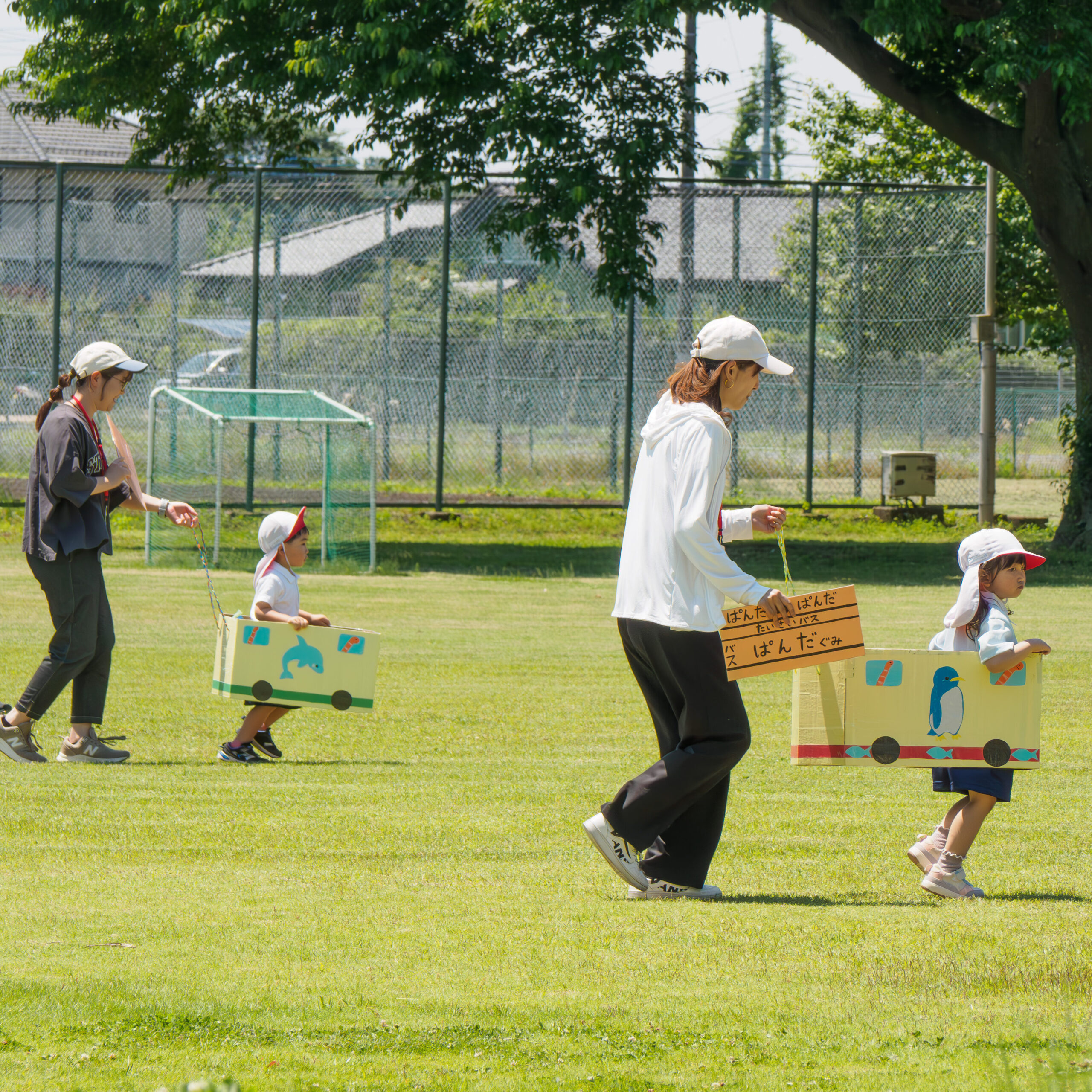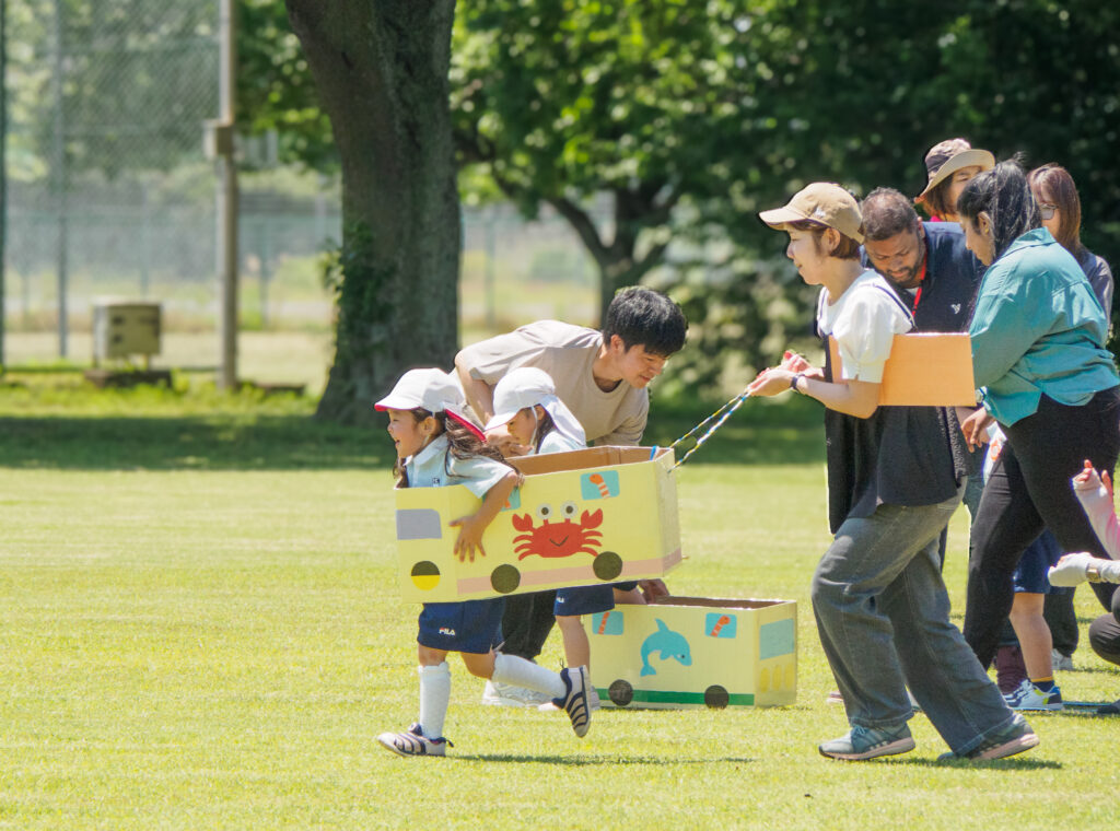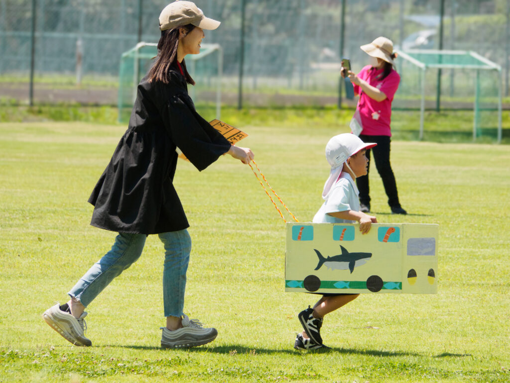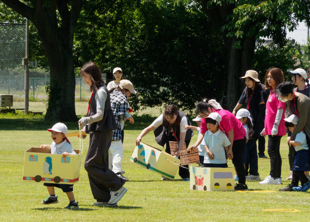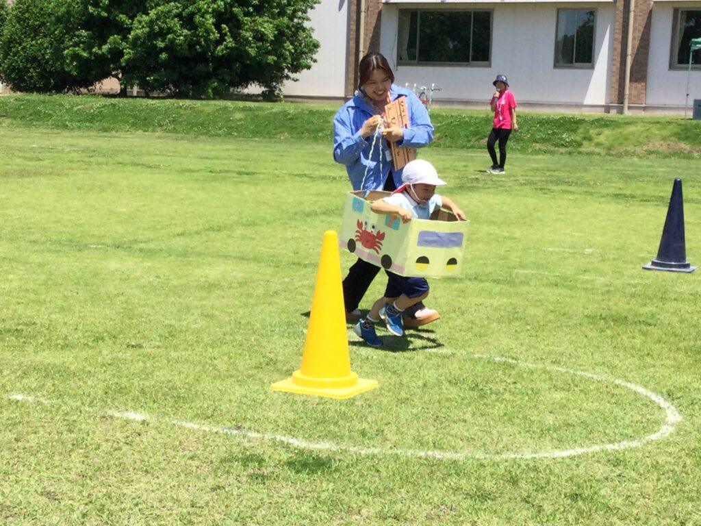 今日はグループに分かれて,お家の方と一緒にバスを運転してリレーです。