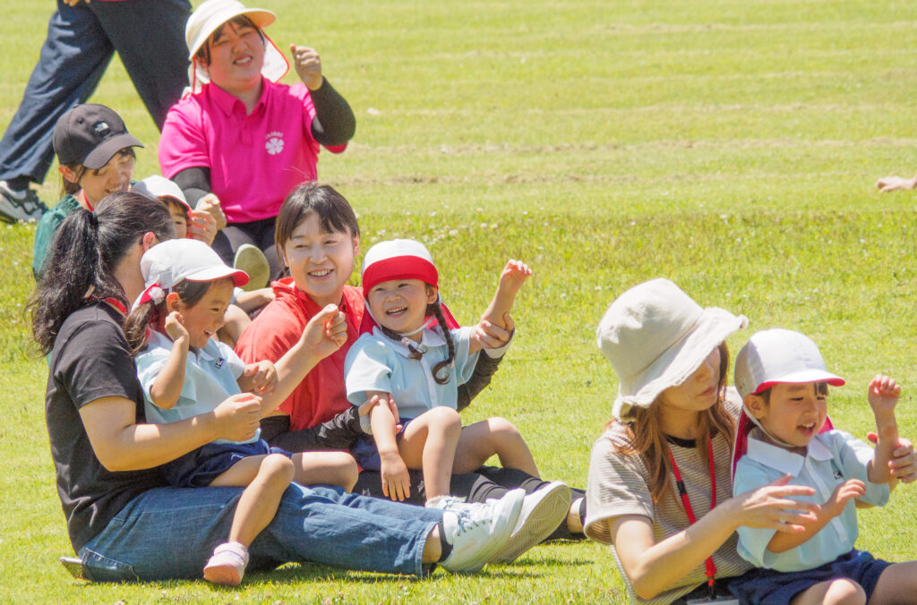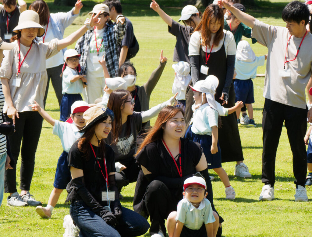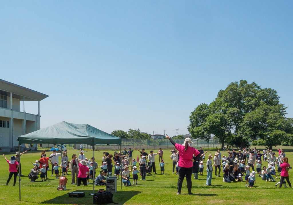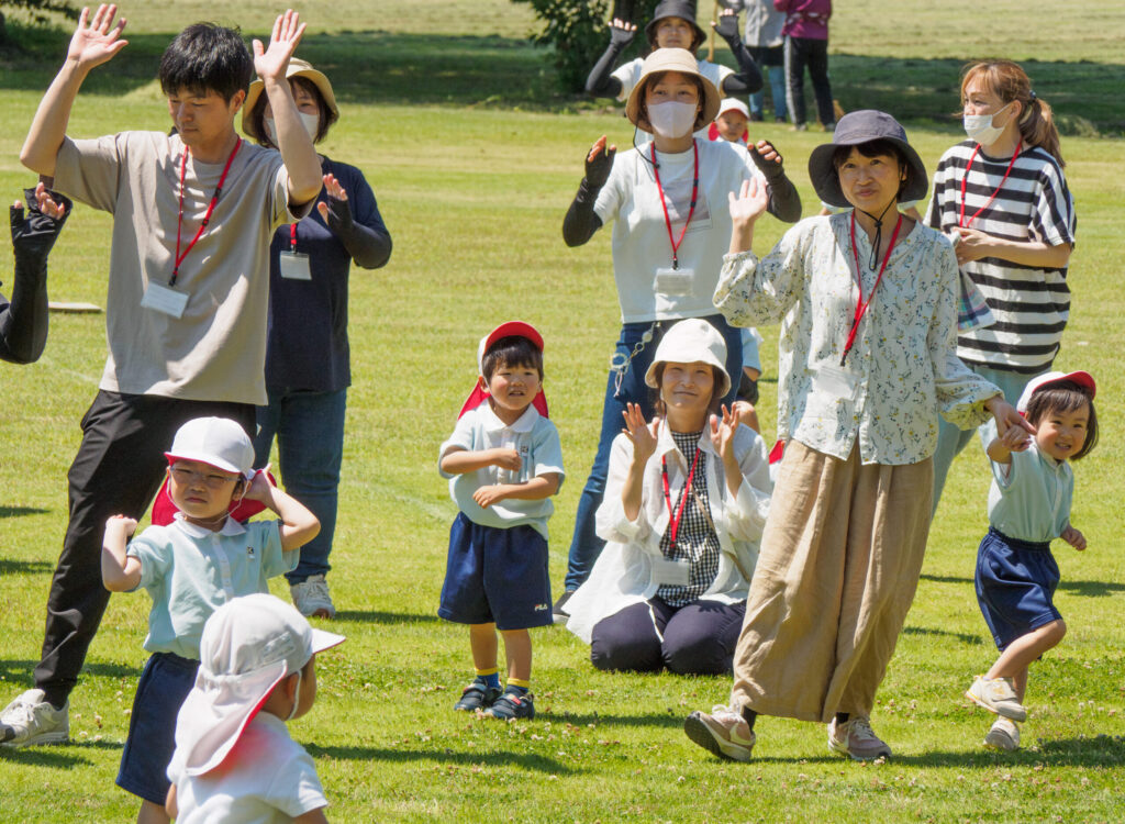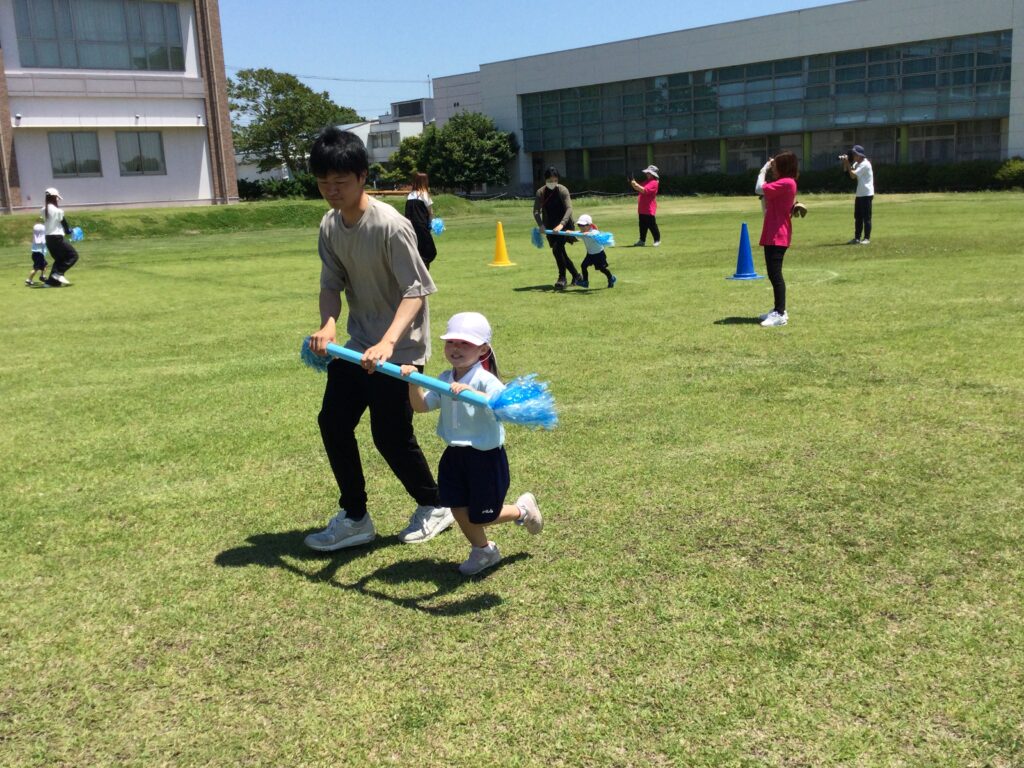 快晴の中,短大の芝生に移動して親子で体操をしました!