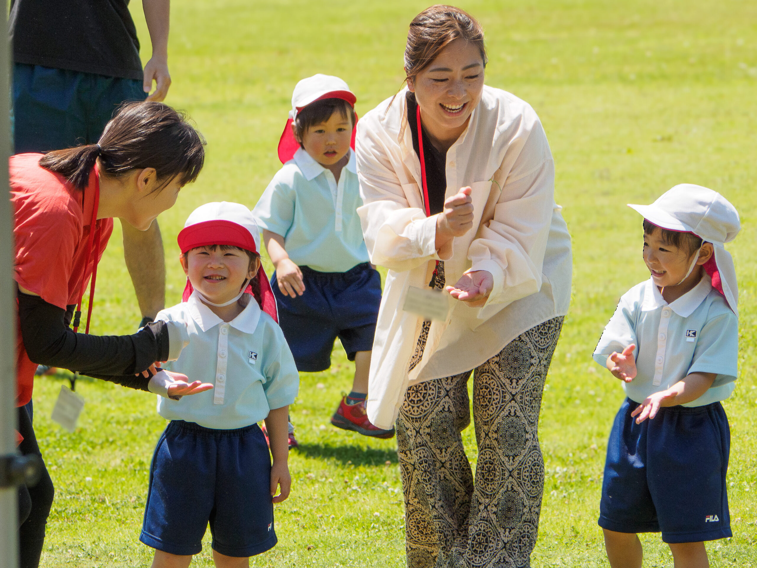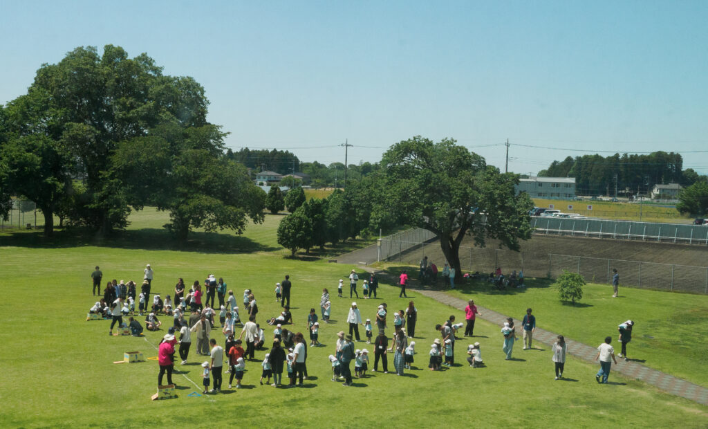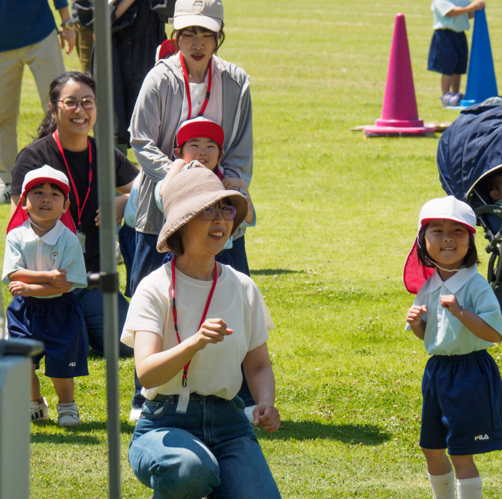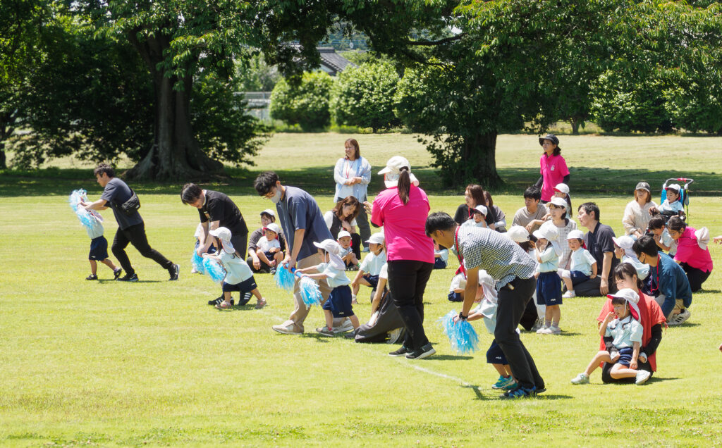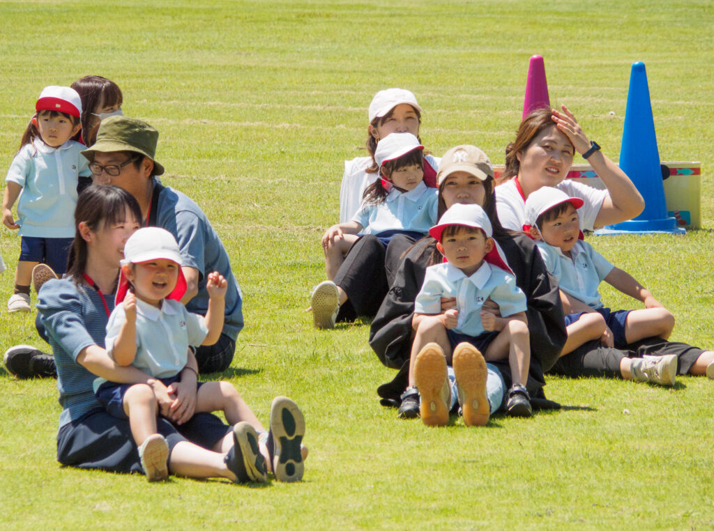 快晴の中,短大の芝生に移動して親子で体操をしました!