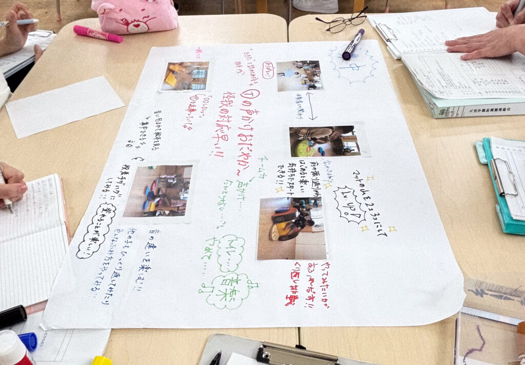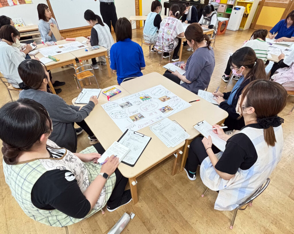 午前中に1歳児クラスの保育を参観し,午後はグループに分かれて意見を出し合いながら保育について協議をしました。