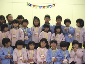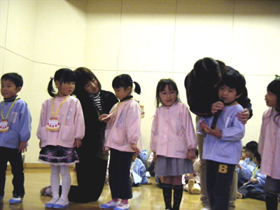 先生に1人ずつお誕生日ケーキの形のペンダントをかけてもらい、嬉しい反面、大勢の人に注目され、照れくさそうな様子です。