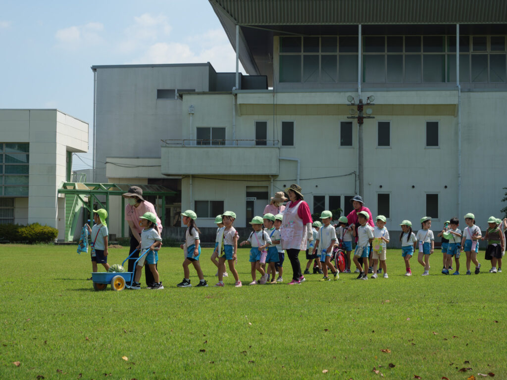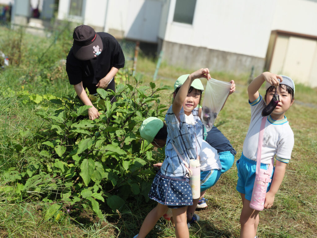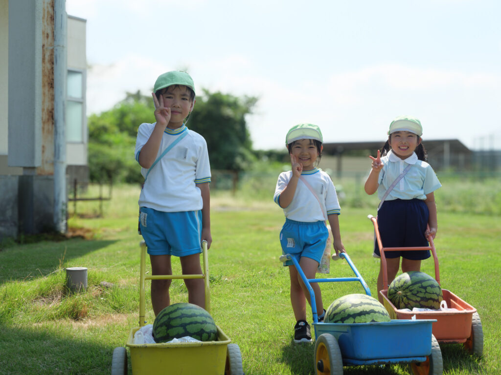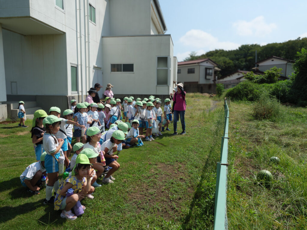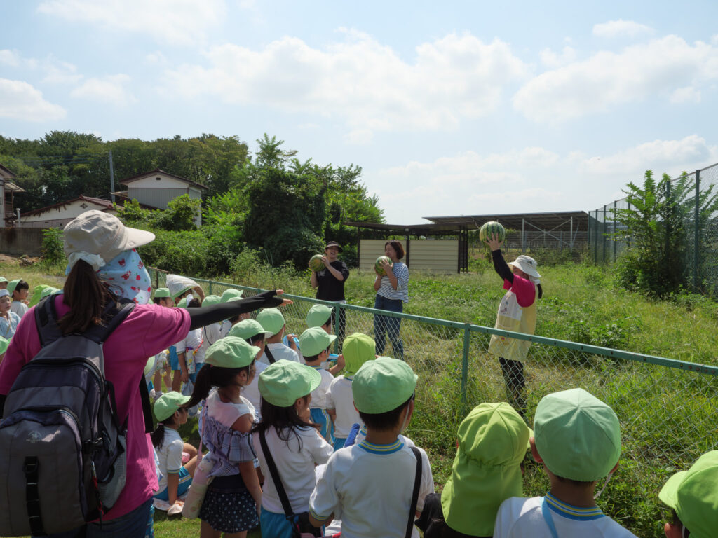 年長児クラスは4月からトマトやきゅうり、ナスなど夏野菜を育てていますが特に楽しみに見守っていたのがスイカでした。9月になりみんなが登園してきたので、スイカを収穫してみることにしました🍉