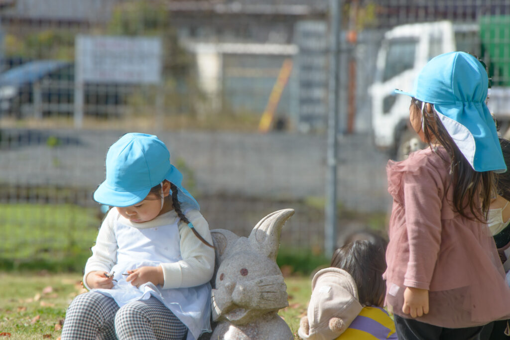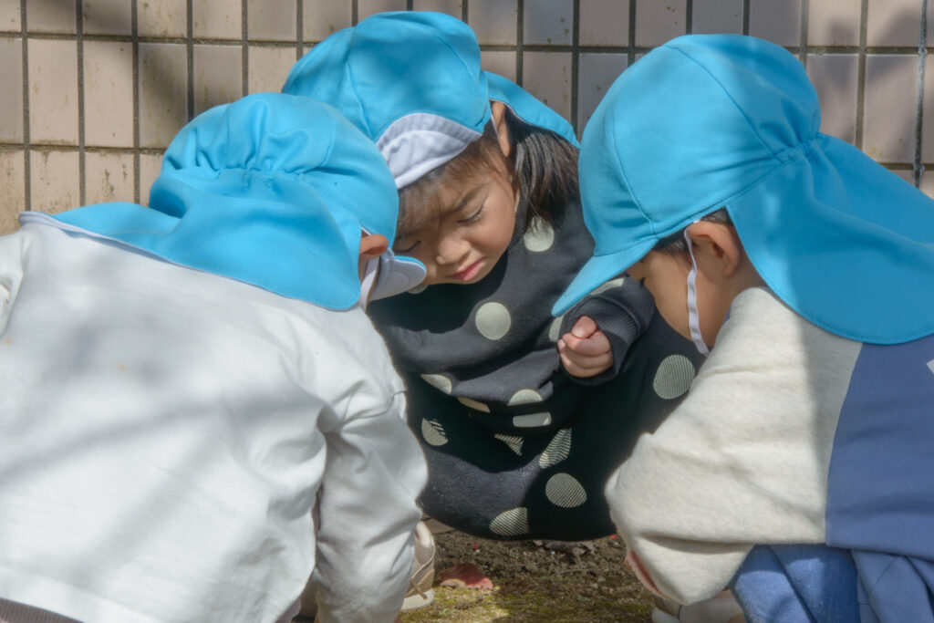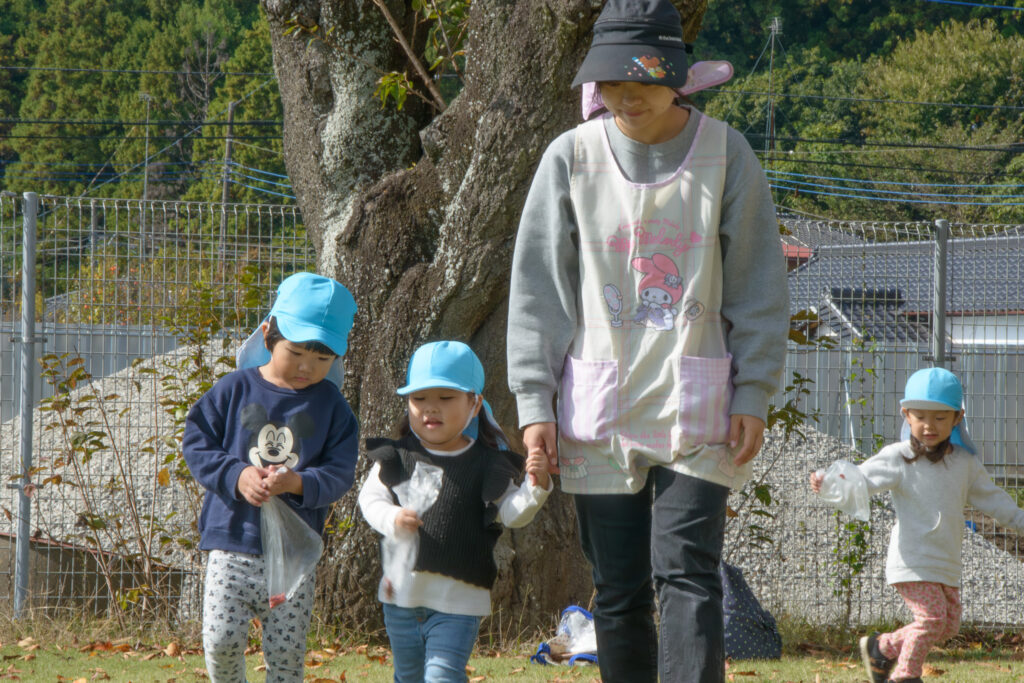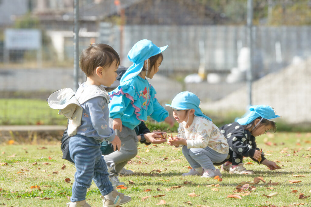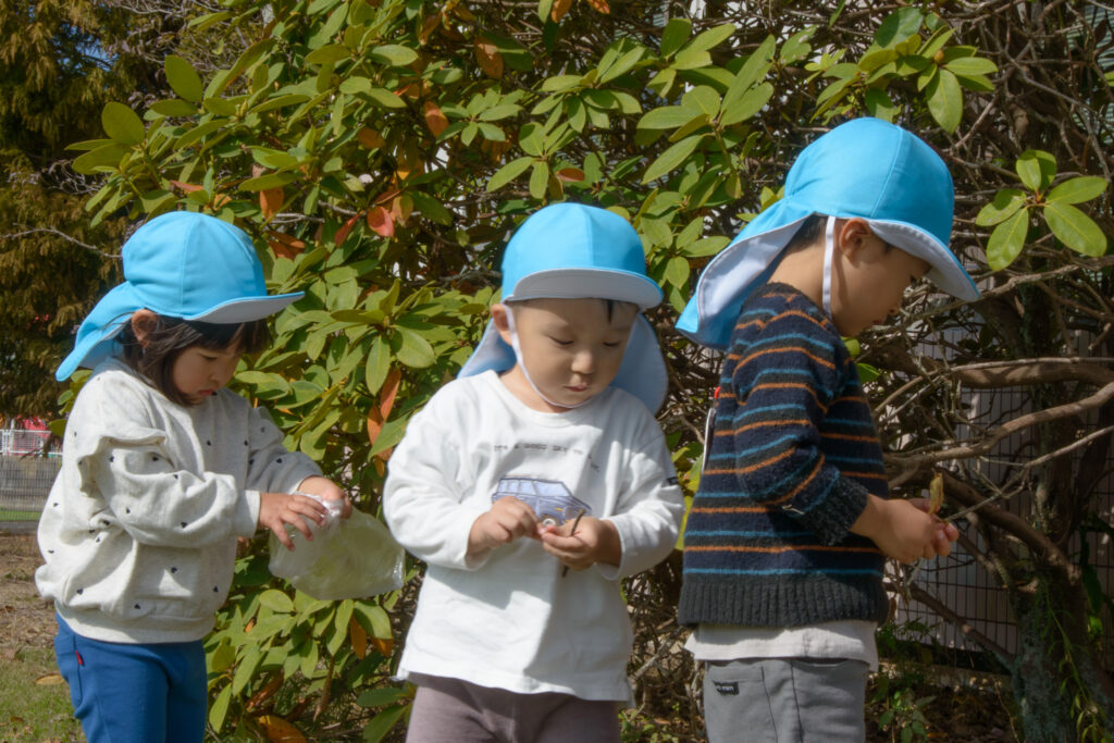 穏やかな秋の午前中、2歳児さんたちが落ち葉や赤い木の実を集めて観察していました🍂