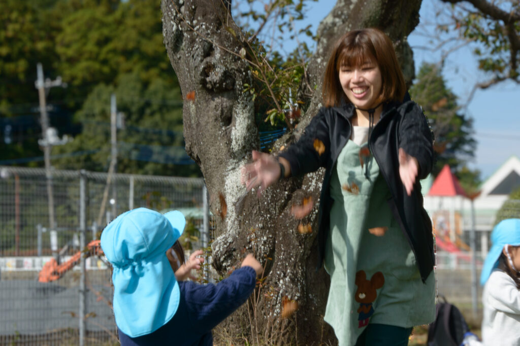 落ち葉の感触、踏んだ時の音、先生が降らせた落ち葉が舞う様子が子どもたちの五感を刺激しみんな楽しそうでした😄