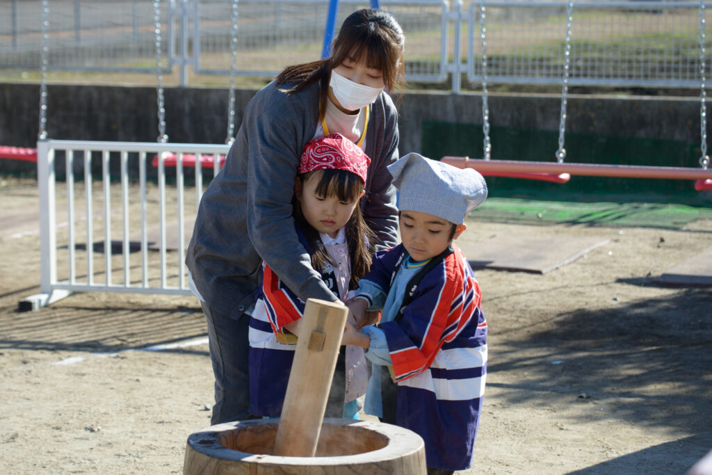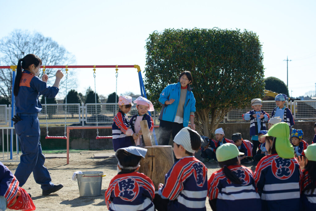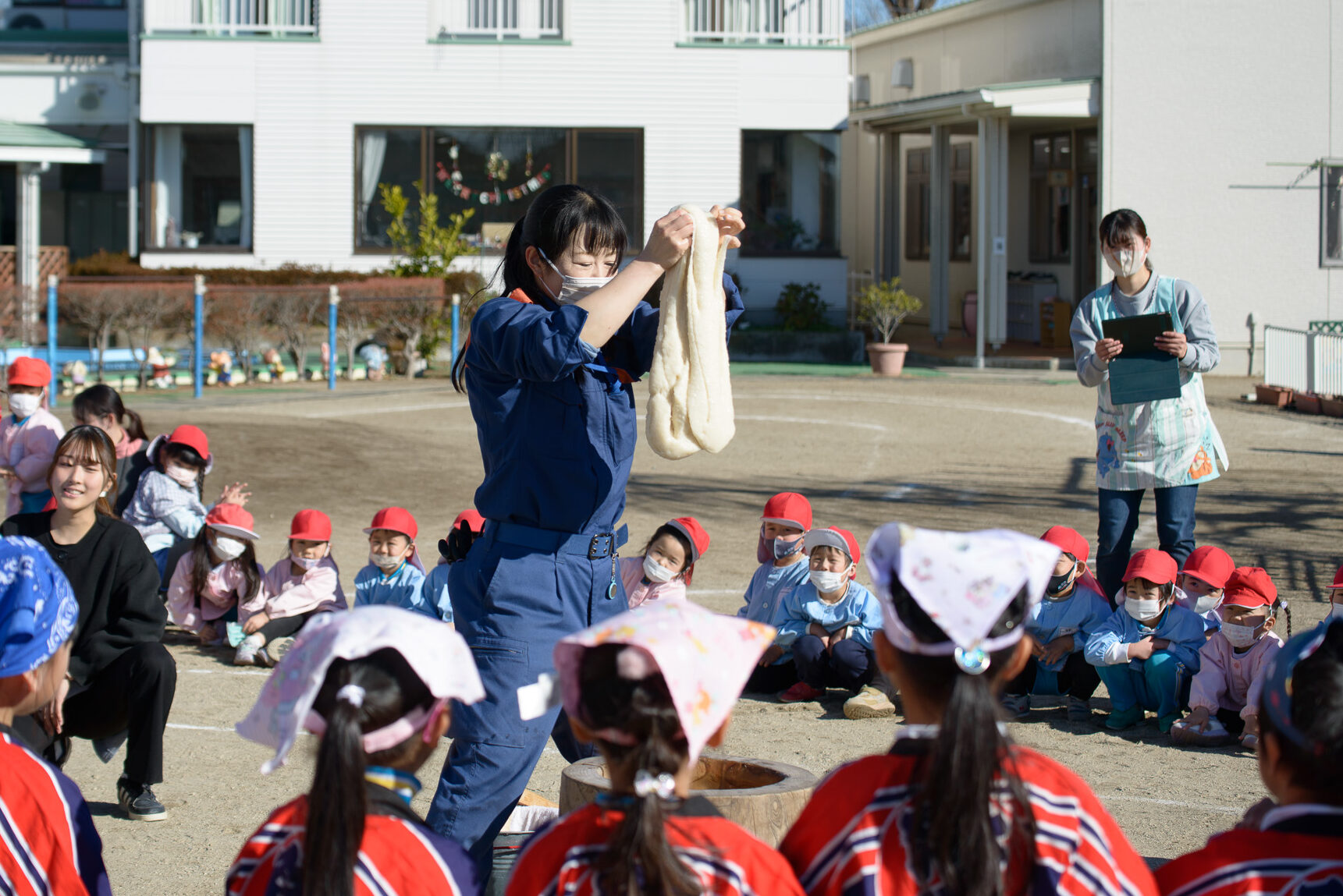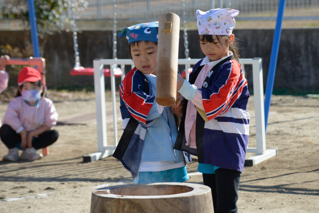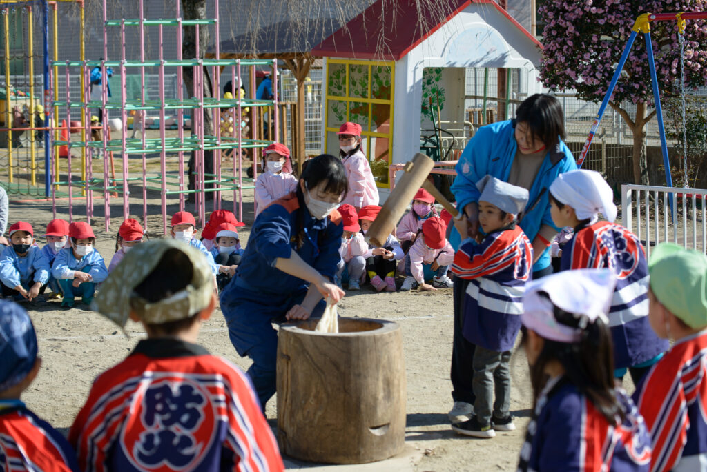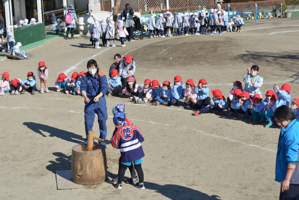 那珂市消防本部のご協力をいただき、年長児さんたちがお餅つきをしました💦