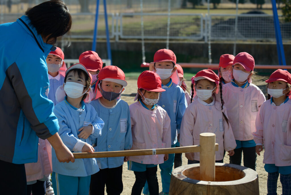 消防の方にきねの持ち方や餅のつき方を教えていただきました。
