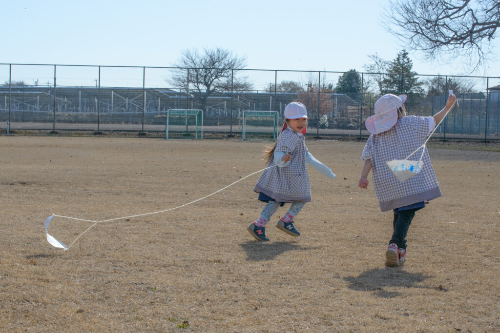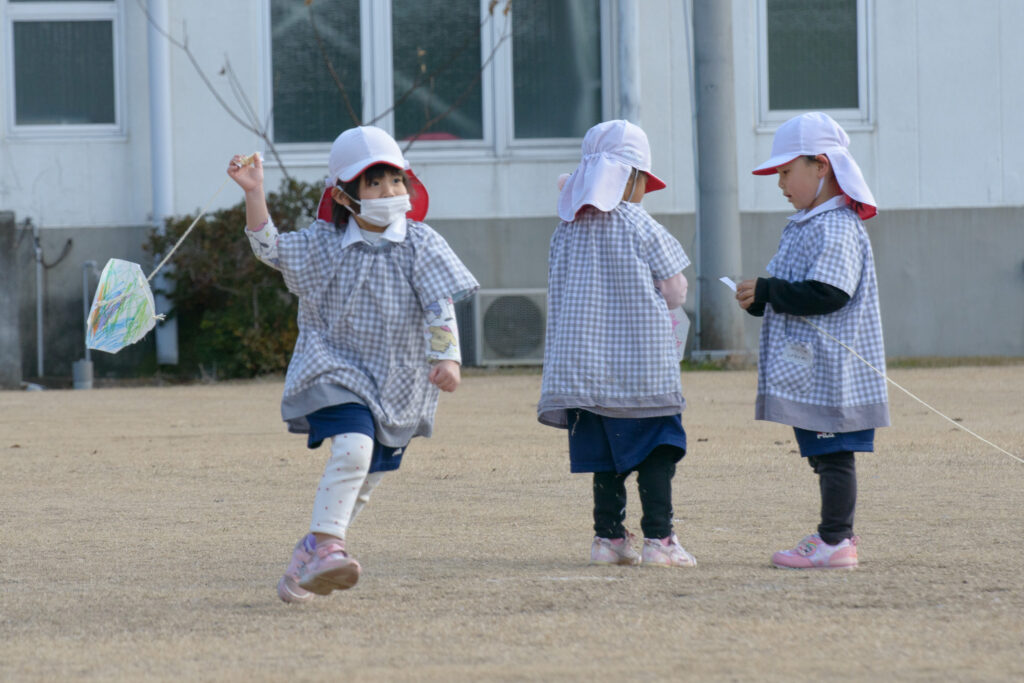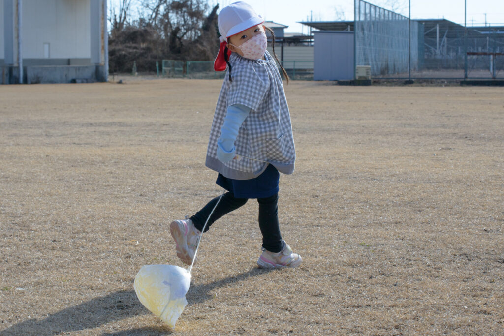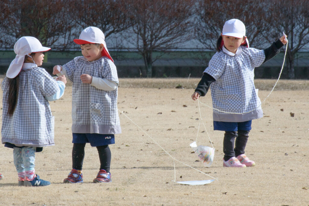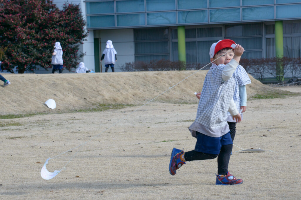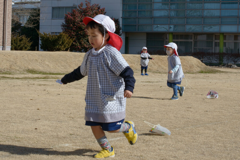 3歳児(ひつじ組)さんたちが凧(たこ)揚げをしていました🪁