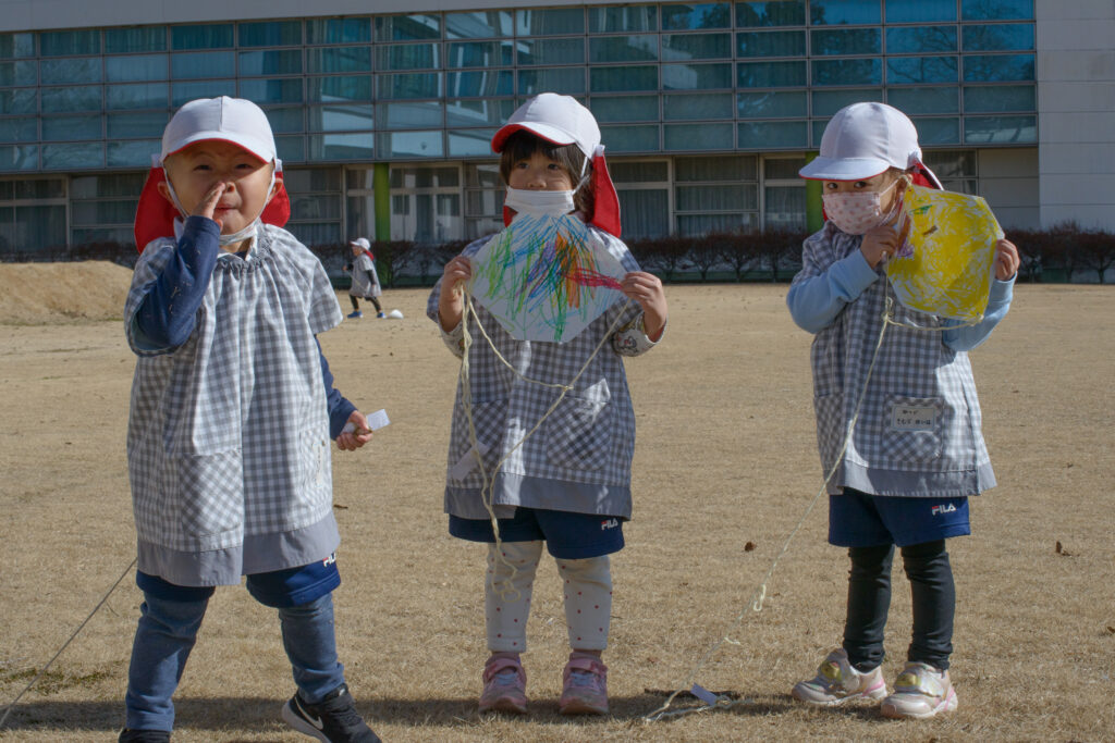 こども園事務室の窓から(凧揚げしたよ 3歳児 2026.1.14)