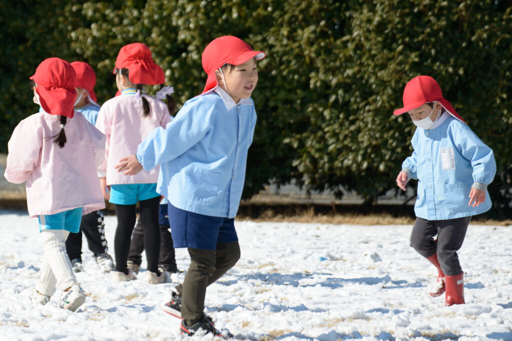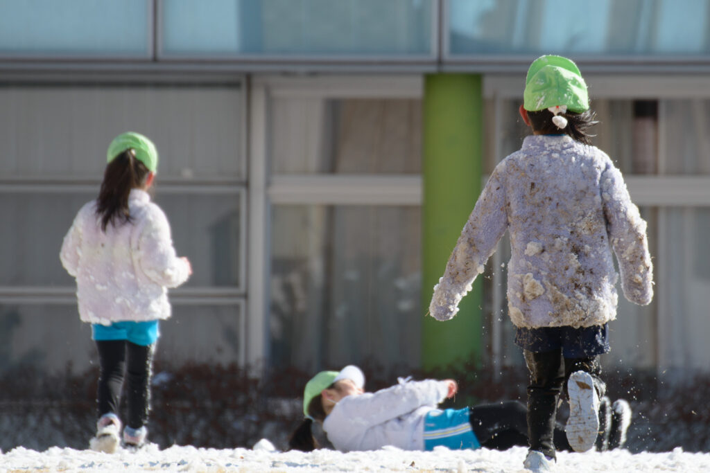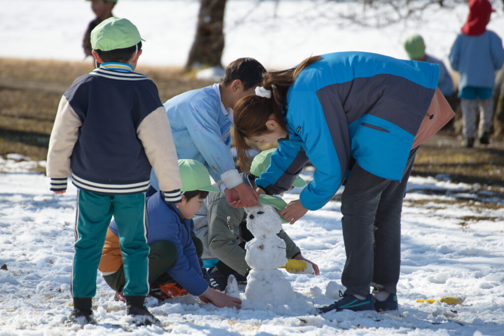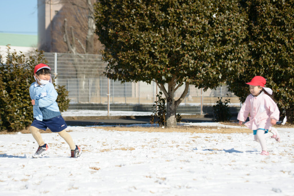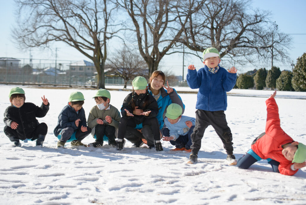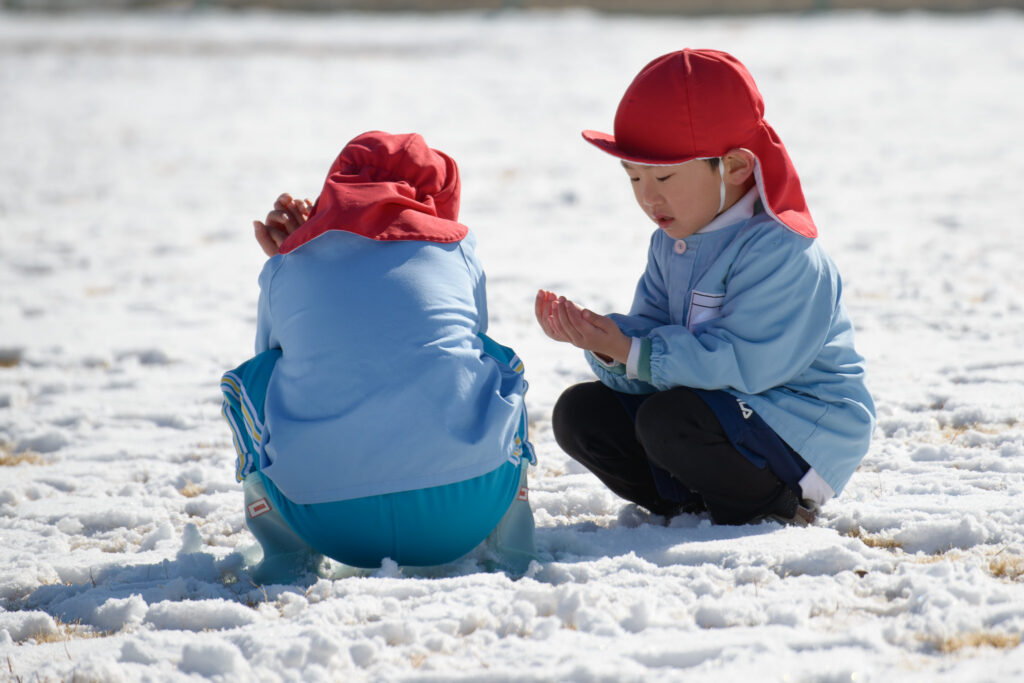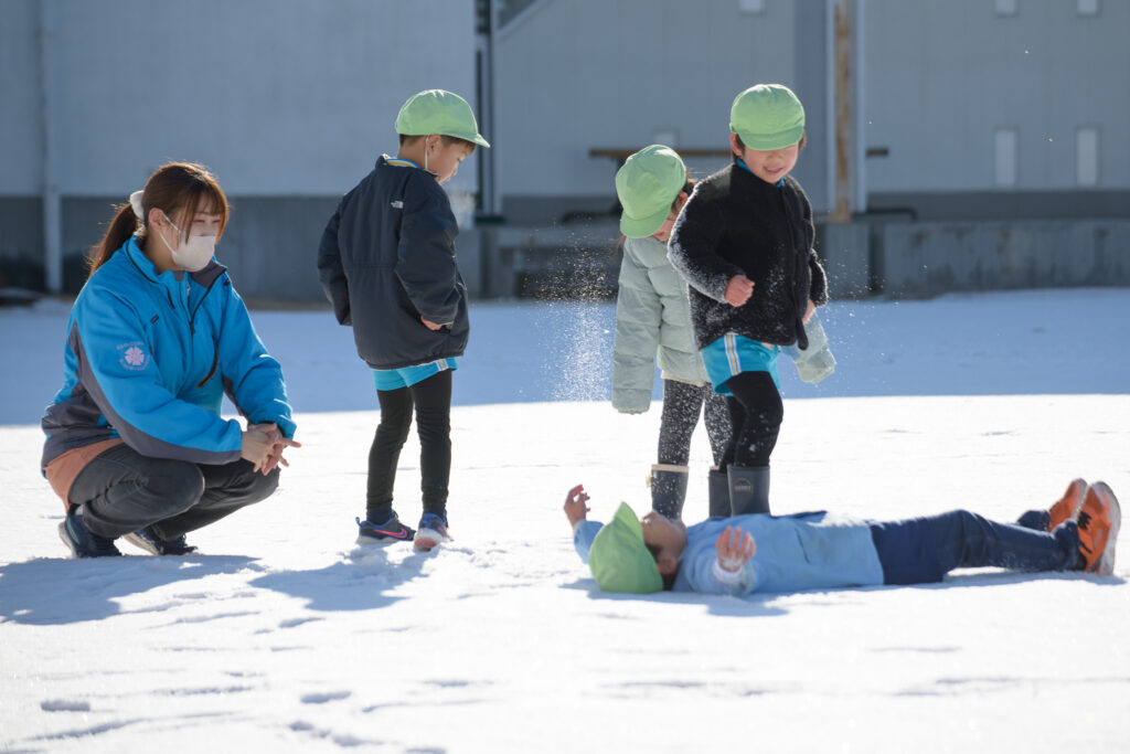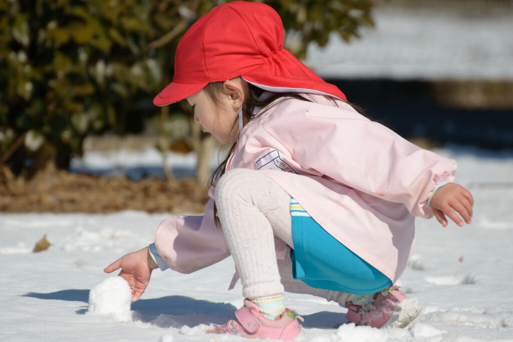 芝生の雪はふわふわで、触ると「柔らかいね」、「つめたい!」と言いながらも、雪の上で寝転んだり、雪だるまを作ったりとても楽しそうでした⛄️