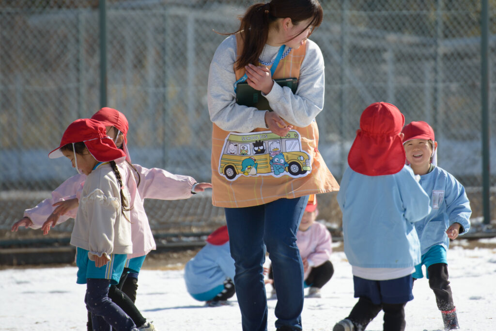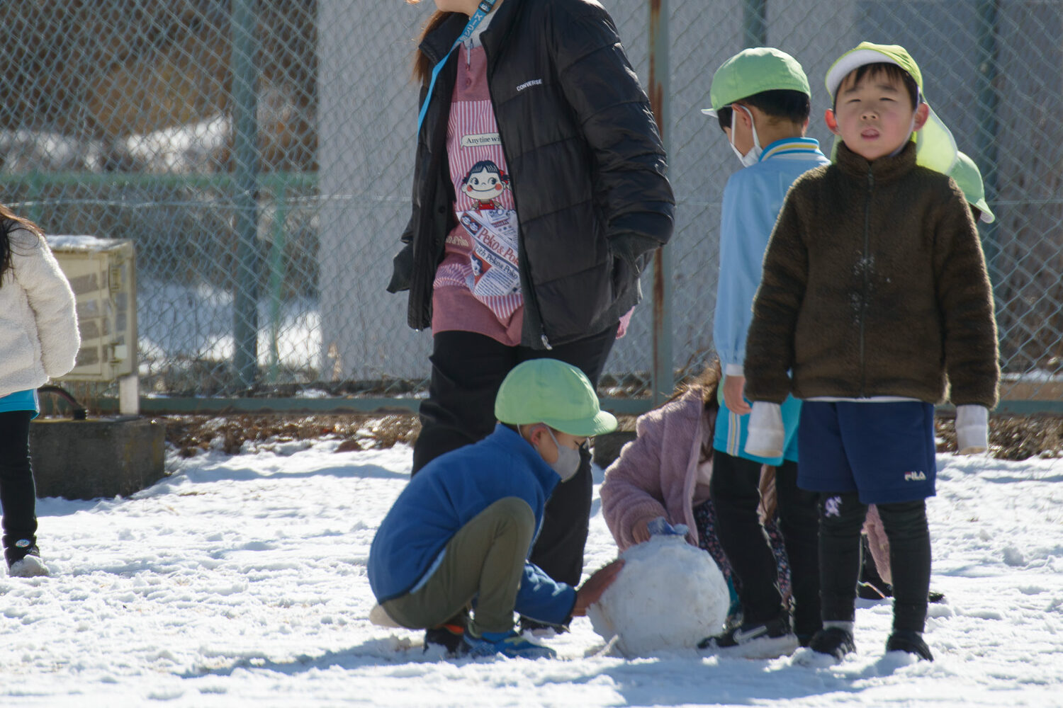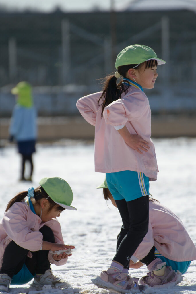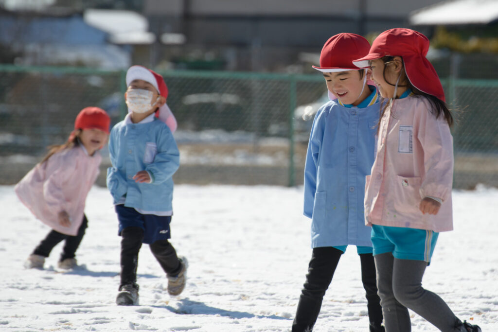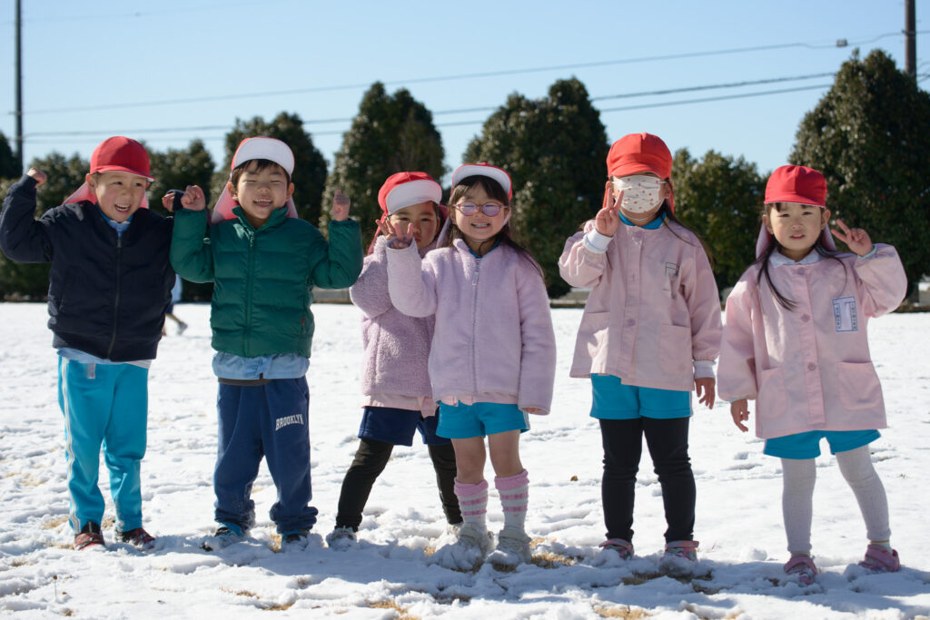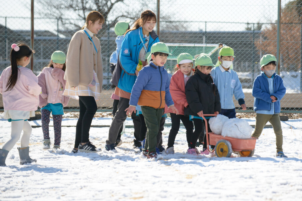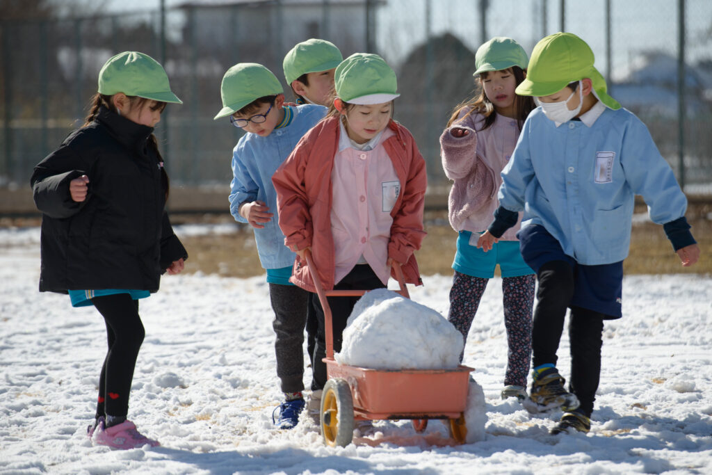 芝生の雪はふわふわで、触ると「柔らかいね」、「つめたい!」と言いながらも、雪の上で寝転んだり、雪だるまを作ったりとても楽しそうでした⛄️