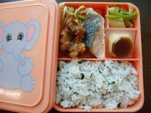 わかめご飯・唐揚げ・鮭の塩焼き・和風パスタソテー・ソーセージの天ぷら・キャベツのおかかあえ・ミニプリン
