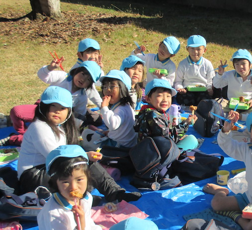副園長先生に給食を運んでもらって、心地よい日差しの下でいただきました。