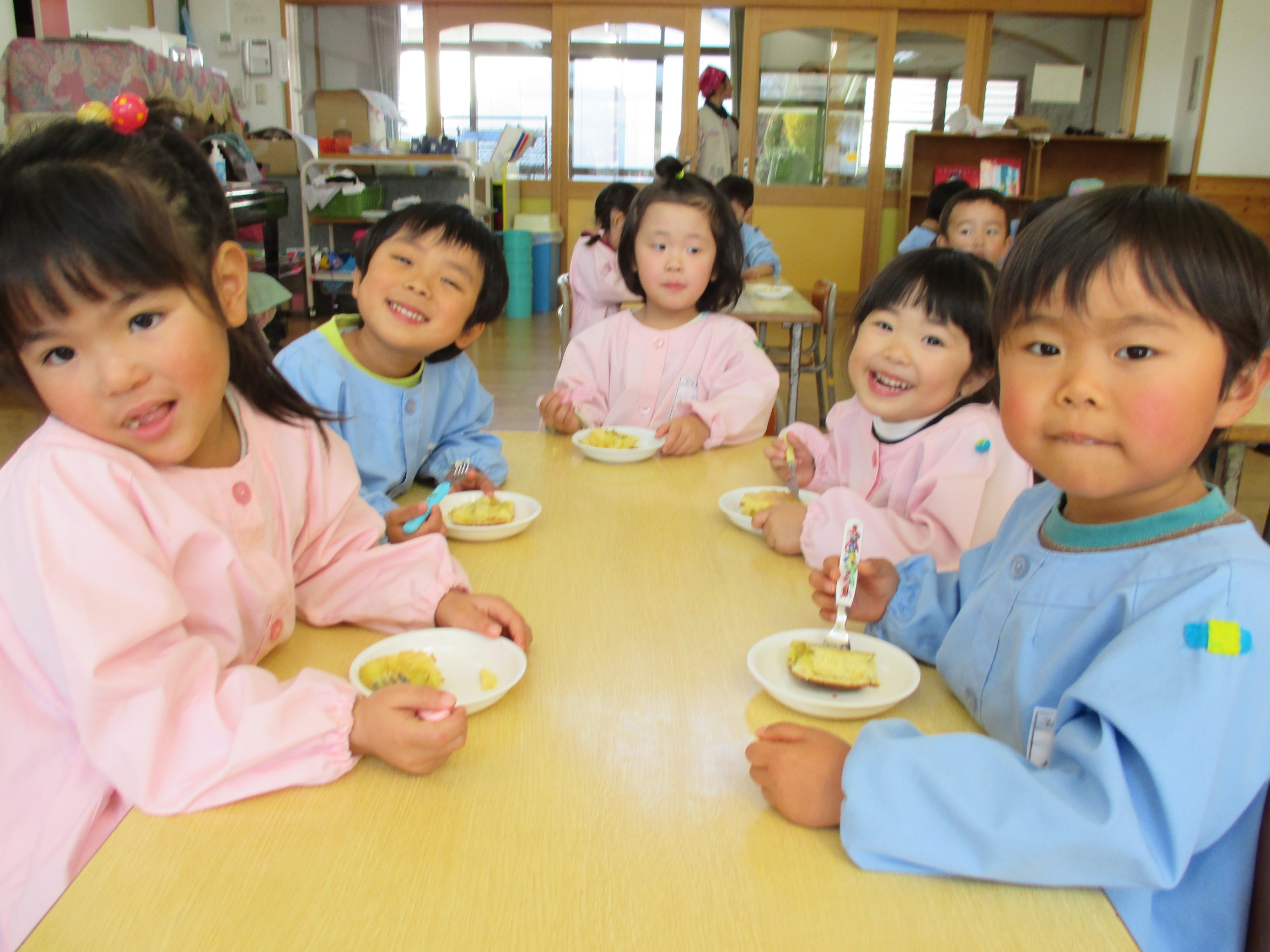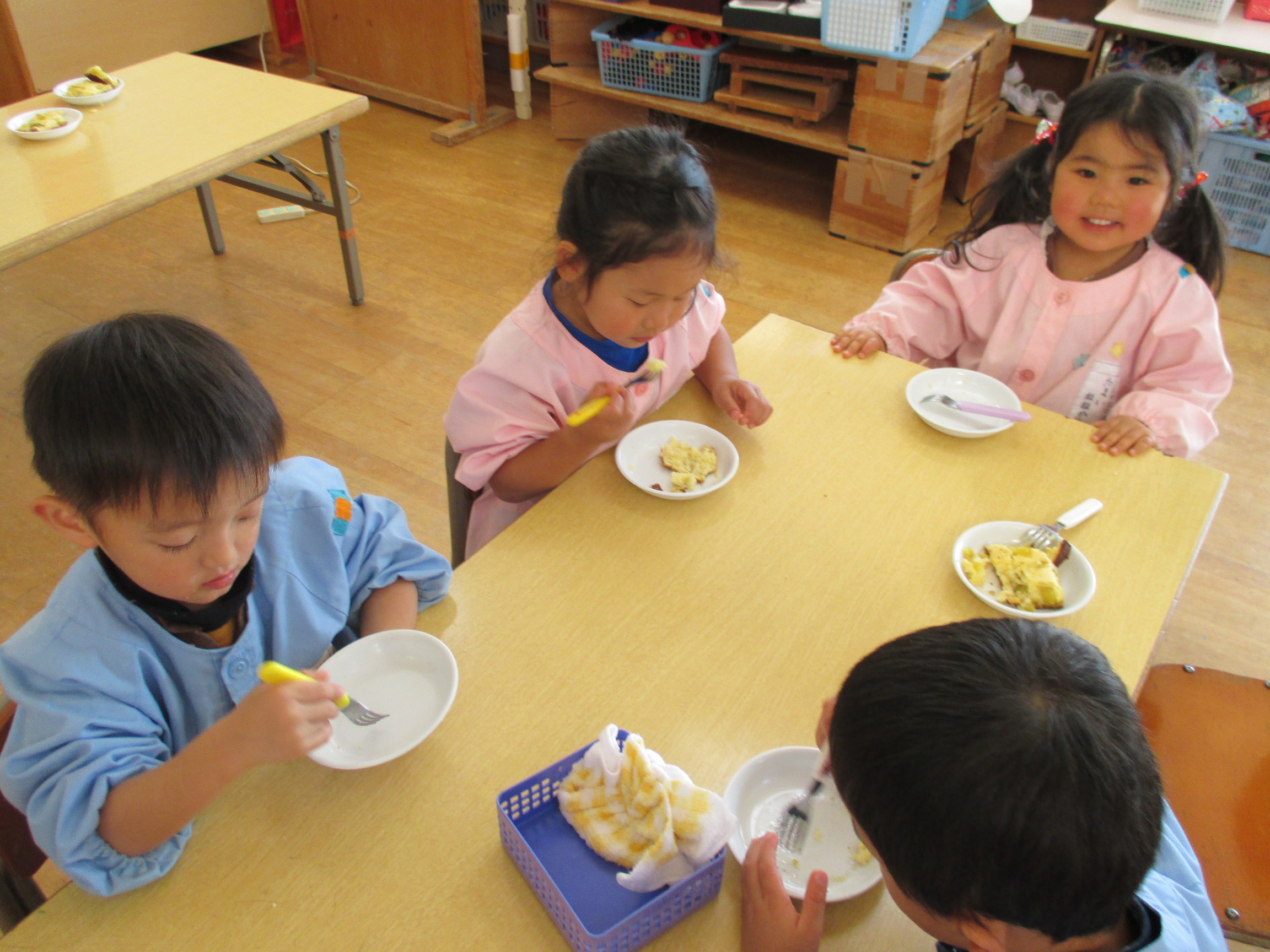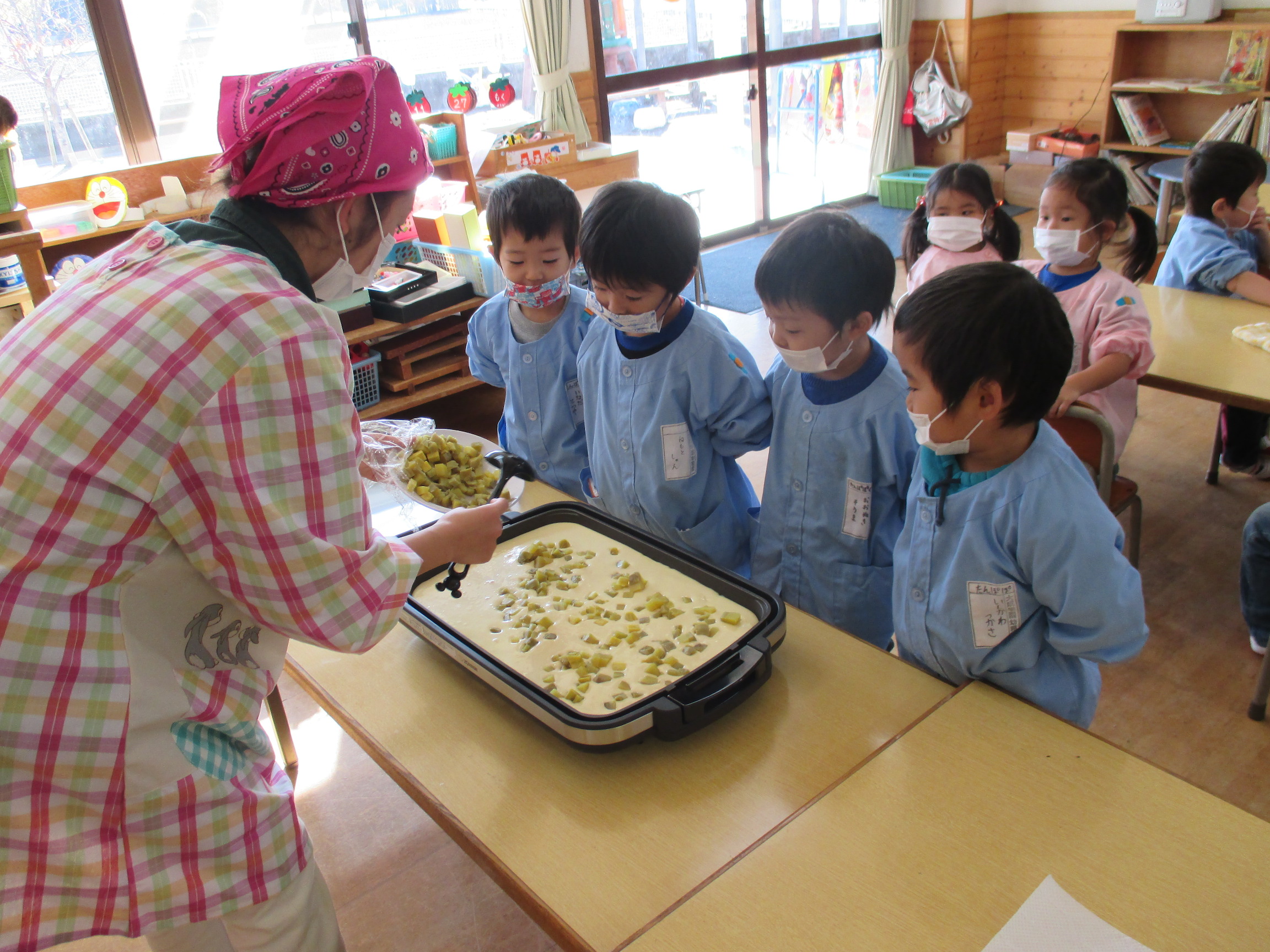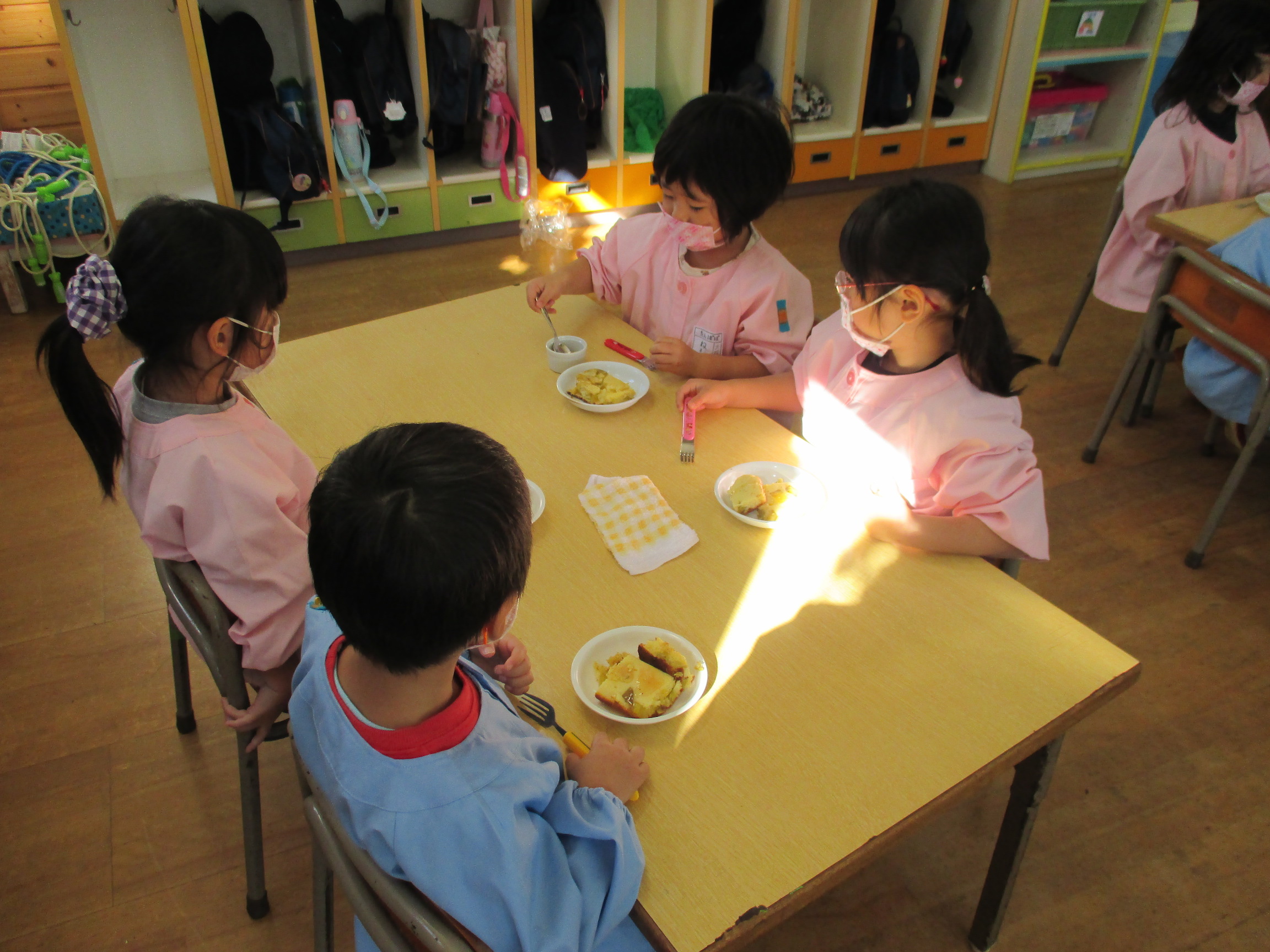 年長さんが短大生と一緒に育てて収穫したサツマイモをおすそ分けしてもらい、年少組では『サツマイモのホットケーキ』を作りました。