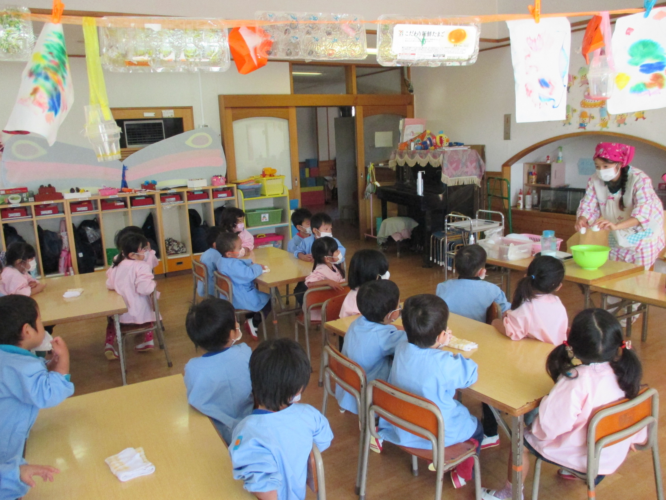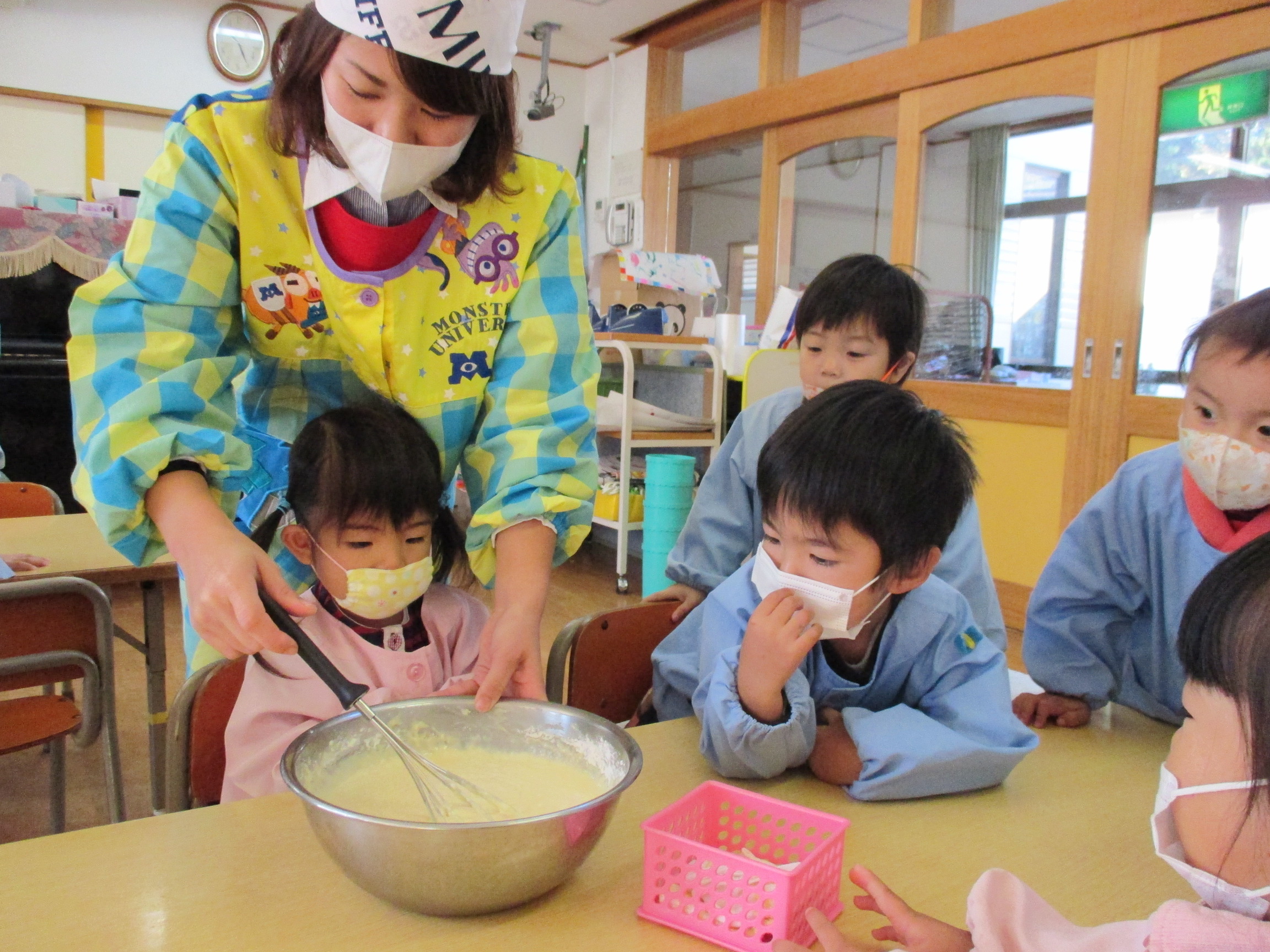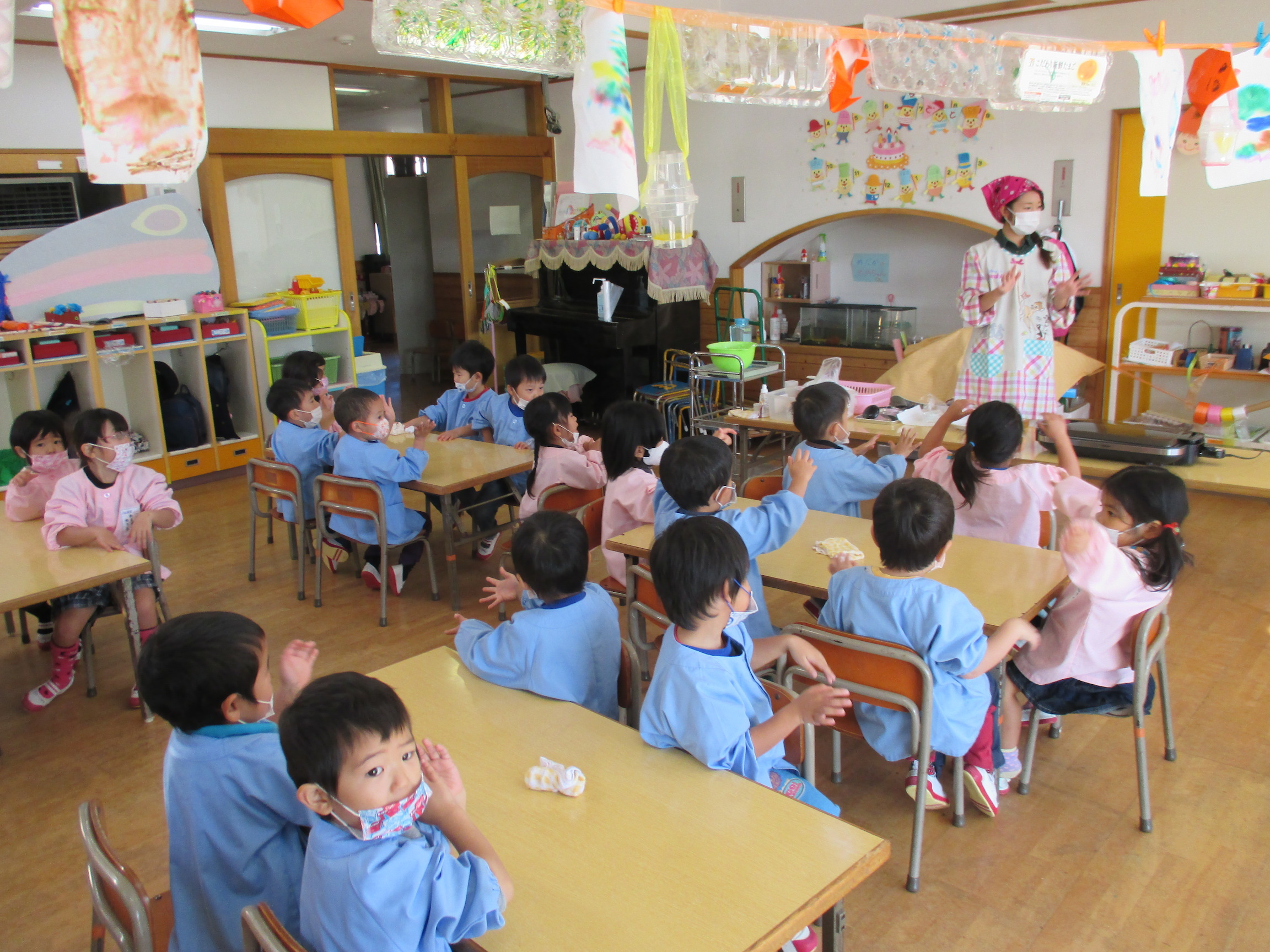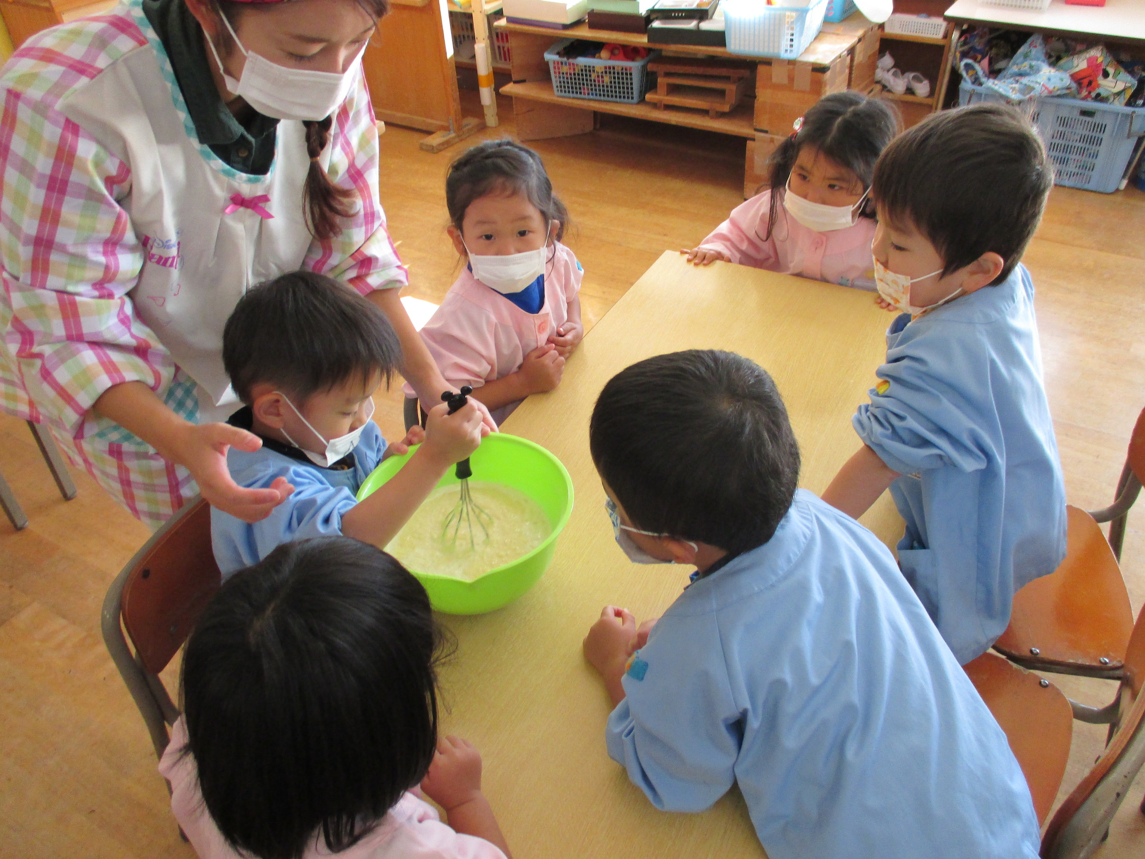 年長さんが短大生と一緒に育てて収穫したサツマイモをおすそ分けしてもらい、年少組では『サツマイモのホットケーキ』を作りました。