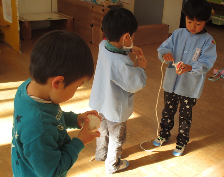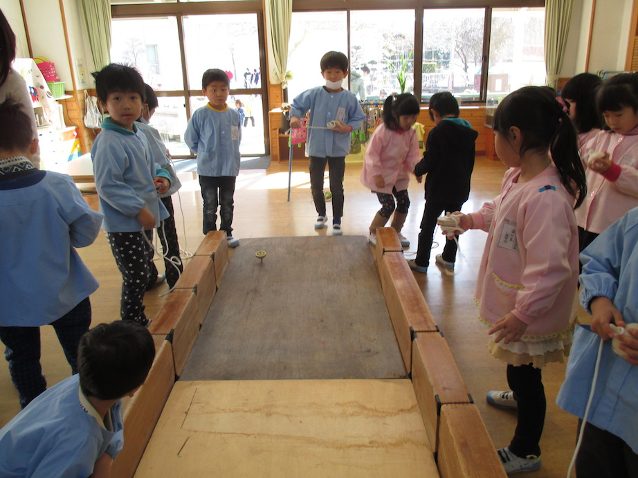 年長組では、クリスマス会でサンタさんにもらったこまを使ってこま回しを頑張っています。