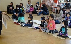 「おおきなかぶ」の大型絵本の読み聞かせでは、大きな声で「うんとこしょ、どっこいしょ」「うんとこしょ、どっこいしょ」とかけ声をかける姿が見られました。