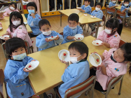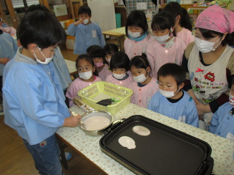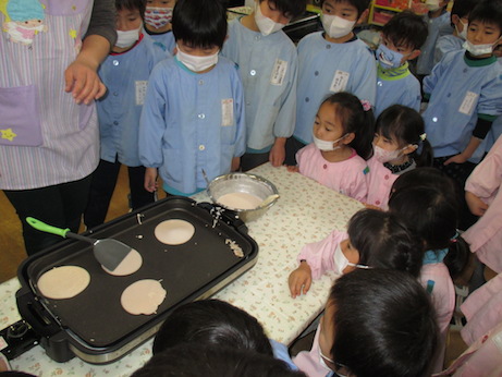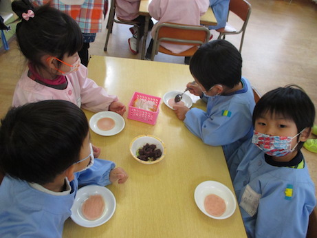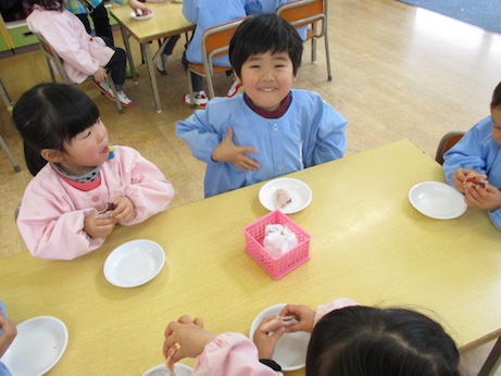 もうすぐひな祭りも近いということで、今回は、いちごの桜餅を作りました。生地は年長さんが、焼いてくれました。