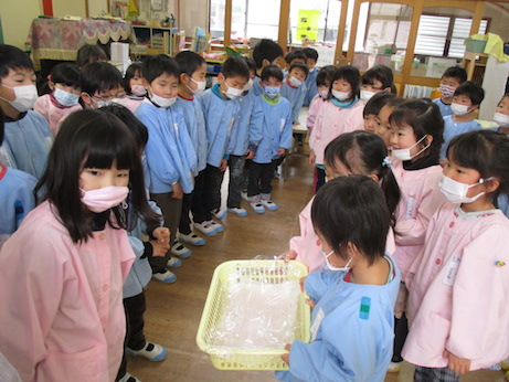 年少さんと年中さんは、作ってもらった生地を受け取って、お礼を言いました。