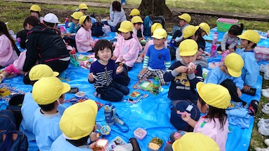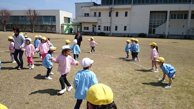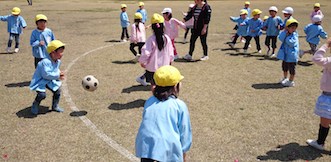 ディズニー体操や、バナナくん体操などをして、その後は、さくら組VSふじ組で転がしドッジボールをしました。