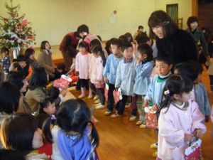 そして…幼稚園に来てくれたお友達にも年中組の小さなサンタさんから靴下のプレゼントを渡しました☆