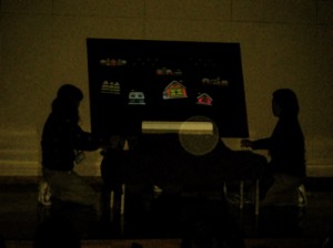 ブラックパネルシアター「あわてんぼうのサンタクロース」を見ました。暗い中に浮かび上がる家やクリスマスツリーに釘付けでした。