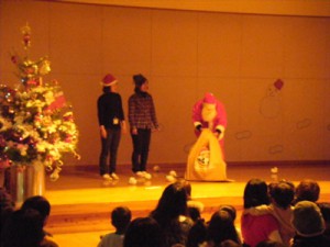 「ぐりとぐらのおきゃくさま」の劇を子供達に披露しました。赤と青の帽子をかぶった「ぐりとぐら」があしあとをたどっていくと…そこにはサンタクロースがいました!いつも友達と元気に遊べるみんなにプレゼントを届けに来てくれたようです!!