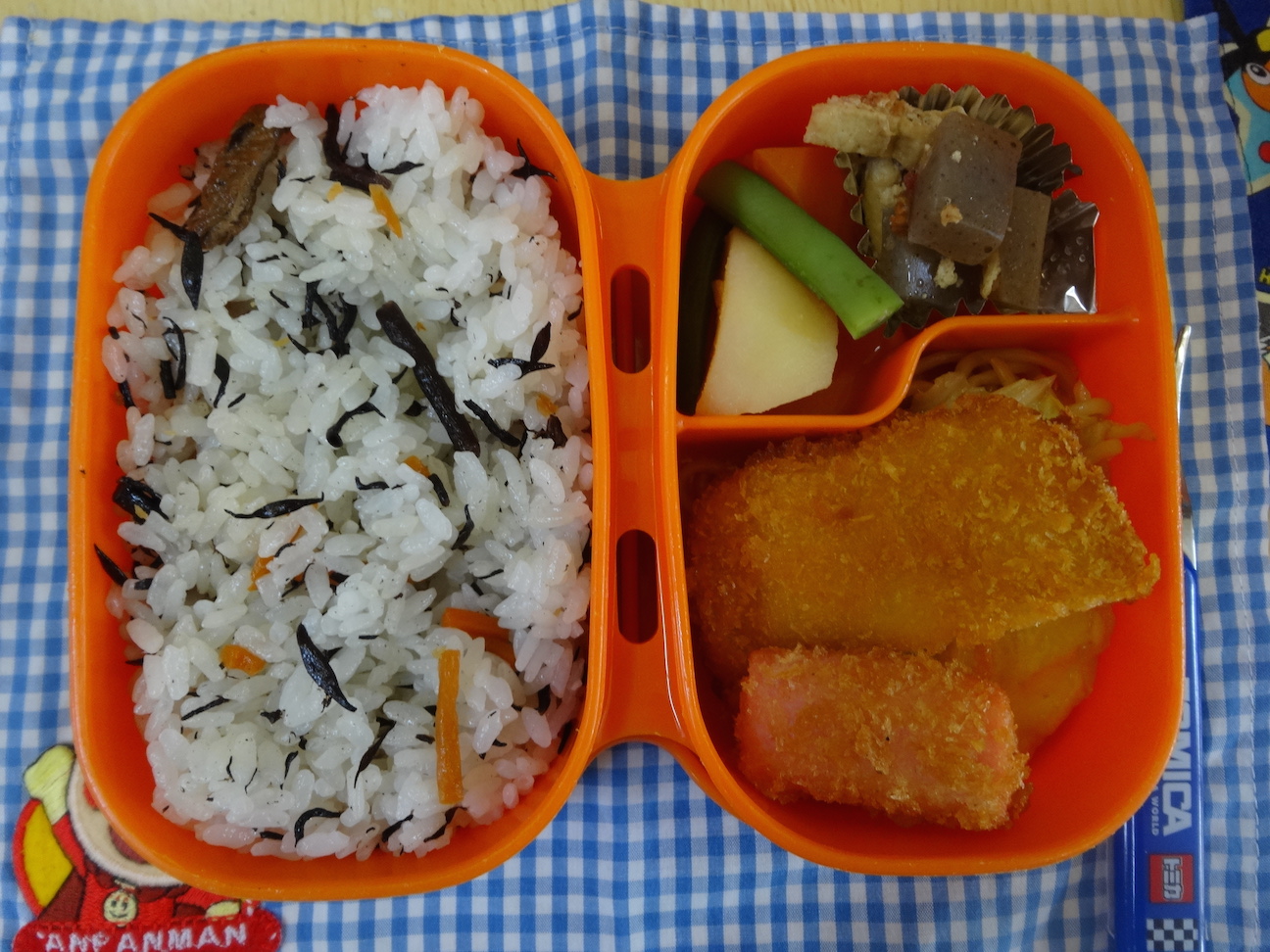 チキンカツ・ソーセージフライ・中華風焼きそば・かに玉・こんにゃくのおかかいため・ポテトの煮物・ひじきごはん
