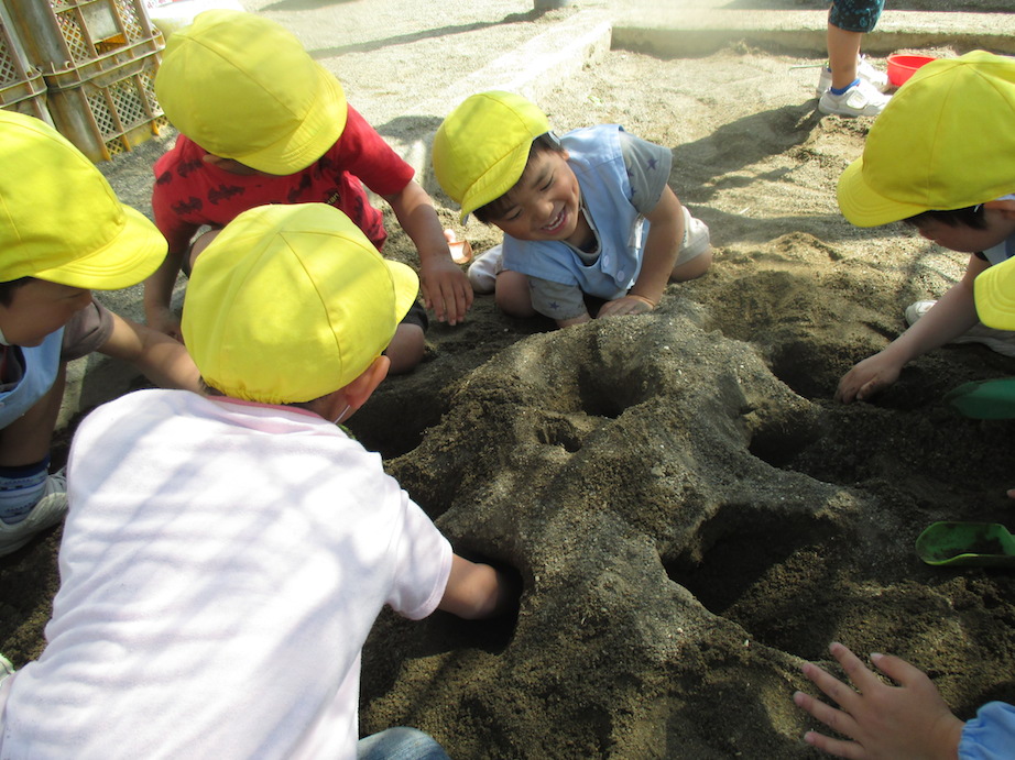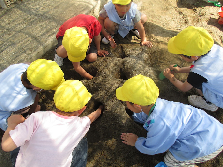 砂場で面白そうなことを始めた子どもたちもいました。