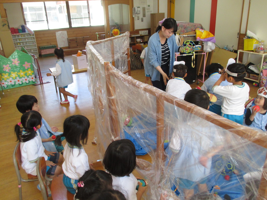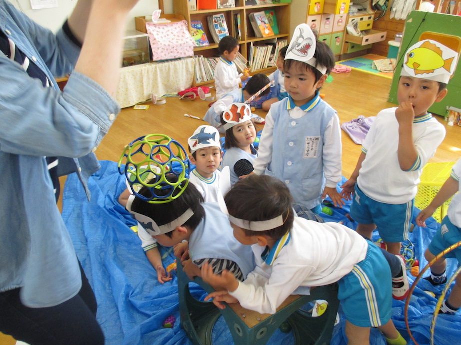 行き先は『もも組水族館』お部屋に入ると、イルカやサメなどの役になりきった子どもたちがショーを見せてくれました。